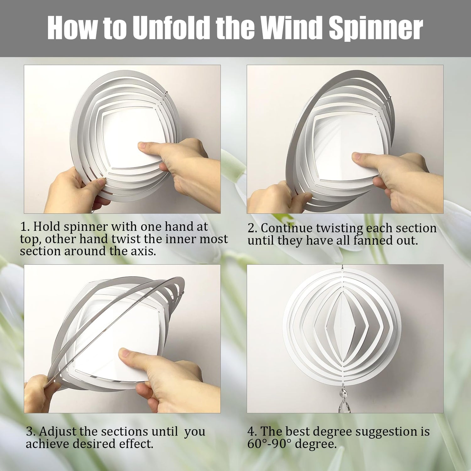 - 【Easy Assemble and Hang】 With easy to follow instructions for installation, no additional tools are necessary. Just pull and tweak to fan out the sections evenly. Simply hang the wind spinner in a location which catches the breeze and enjoy the kinetic movement of our outdoor wind spinners in the slightest of breeze. Designed with a hole on the bottom edge, you can hang some pendants and accessories according to your preferences.