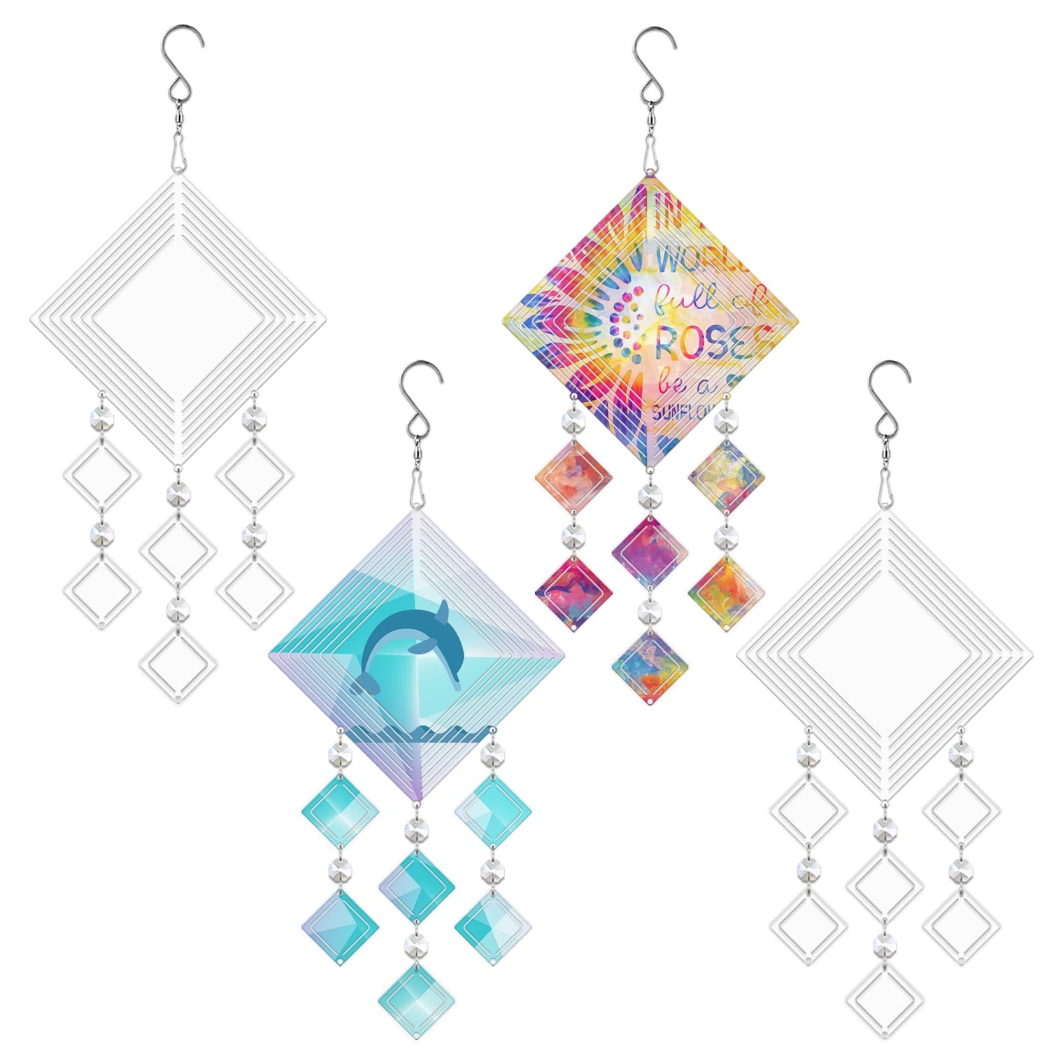 - 【Product Included】Big Wind Spinner Sets: 4pcs 8inch sublimation wind sppinners; 4 pcs 360°rotating hook;12pcs A grade crystal glass chain; 24 pcs sublimation pendants.