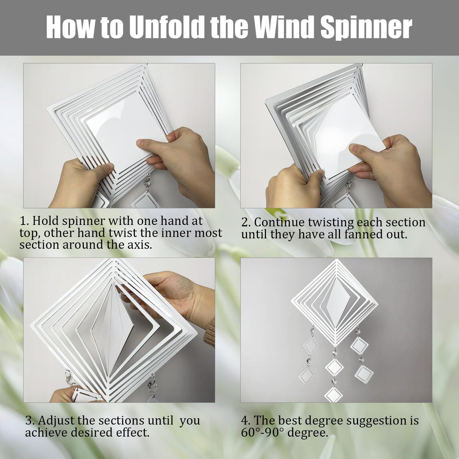 - 【Easy Assemble and Hang】 With easy to follow instructions for installation, no additional tools are necessary. Just pull and tweak to fan out the sections evenly. Simply hang the wind spinner in a location which catches the breeze and enjoy the kinetic movement of our outdoor wind spinners in the slightest of breeze. Designed with a hole on the bottom edge, you can hang some pendants and accessories according to your preferences.