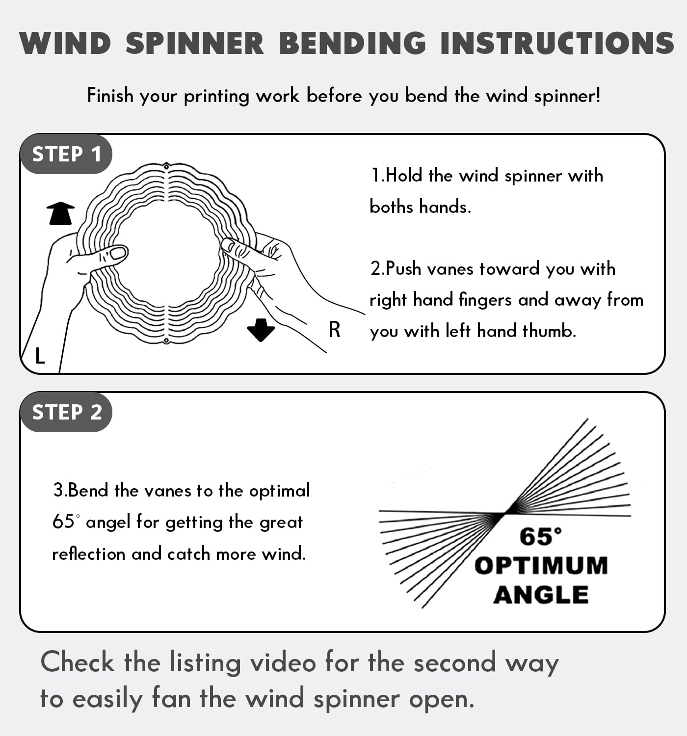 Wind Spinner will get the best reflection and optimal wind when the veins are bent at a 65 degree angle. To achieve this look, push the vanes towards you in the right hand and while simultaneously away from you with the left hand. Gently bend the outer metal rings to your desired shape for the wind spinner.
