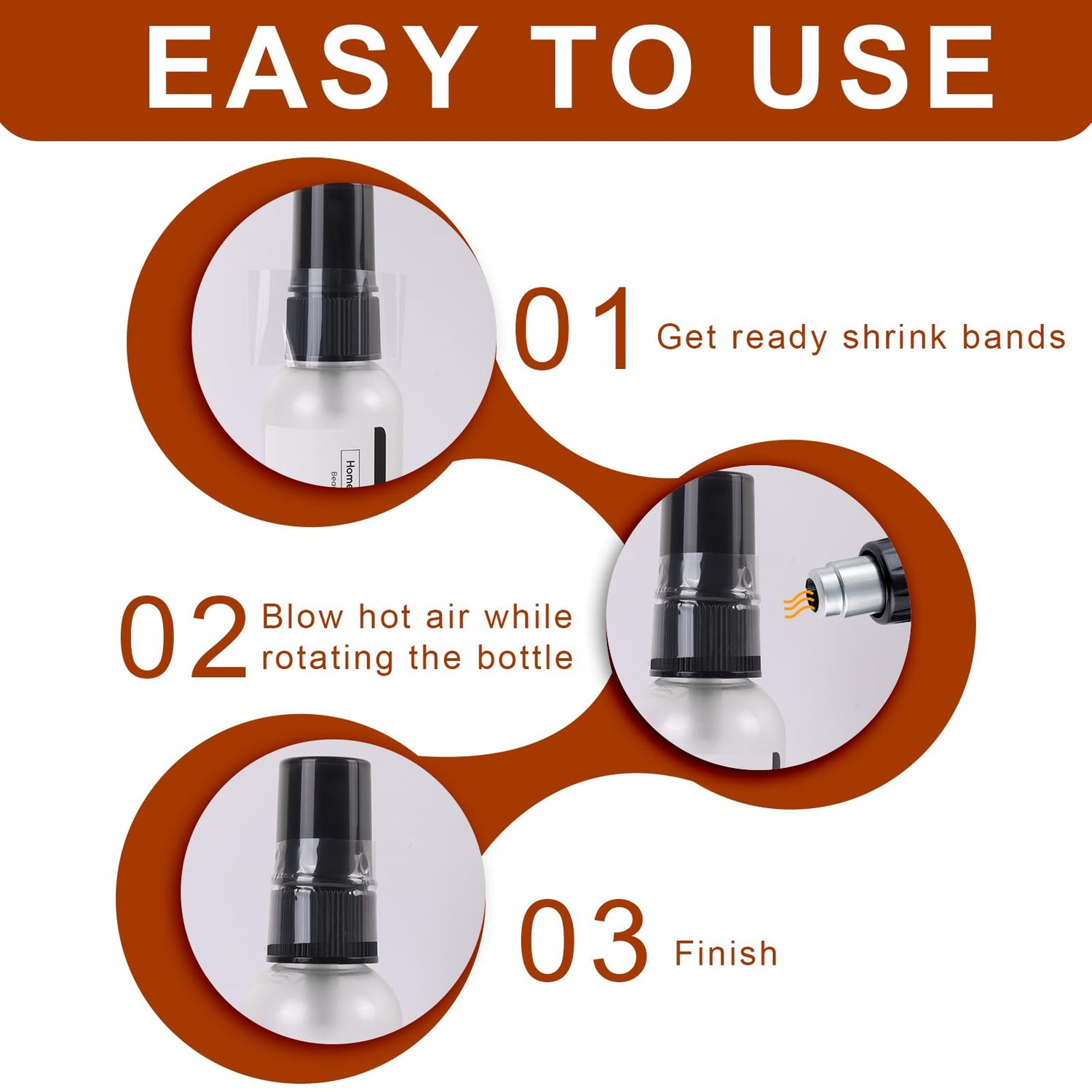 • Easy to use, simply apply heat using a heat shrink wrap sealer or heat gun to shrink the bands tightly around the bottle or container.