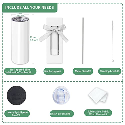 - Package Includes: 8 pieces of 20 oz straight sublimation skinny tumblers with stainless steel straws and splash-proof lid in this package, we also provide 4 pack and 12 pack, you can check the viarations in the listing. you can buy bulk tumblers to DIY Unique tumbler for your family member or your friends you really care.