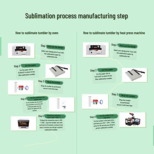 - Two Way to Sublimate Your Tumbler: If you choose heat press machine to sublimate your tumblers,Recommended time is 50 seconds,Recommended Temperature is 334 Degree Fahrenheit,If you choose oven to sublimate your tumbler,Recommend time is 6 minutes,Recommended temperature is 300 Degree Fahrenheit; Attention:Both best done with sublimation shrink wrap,