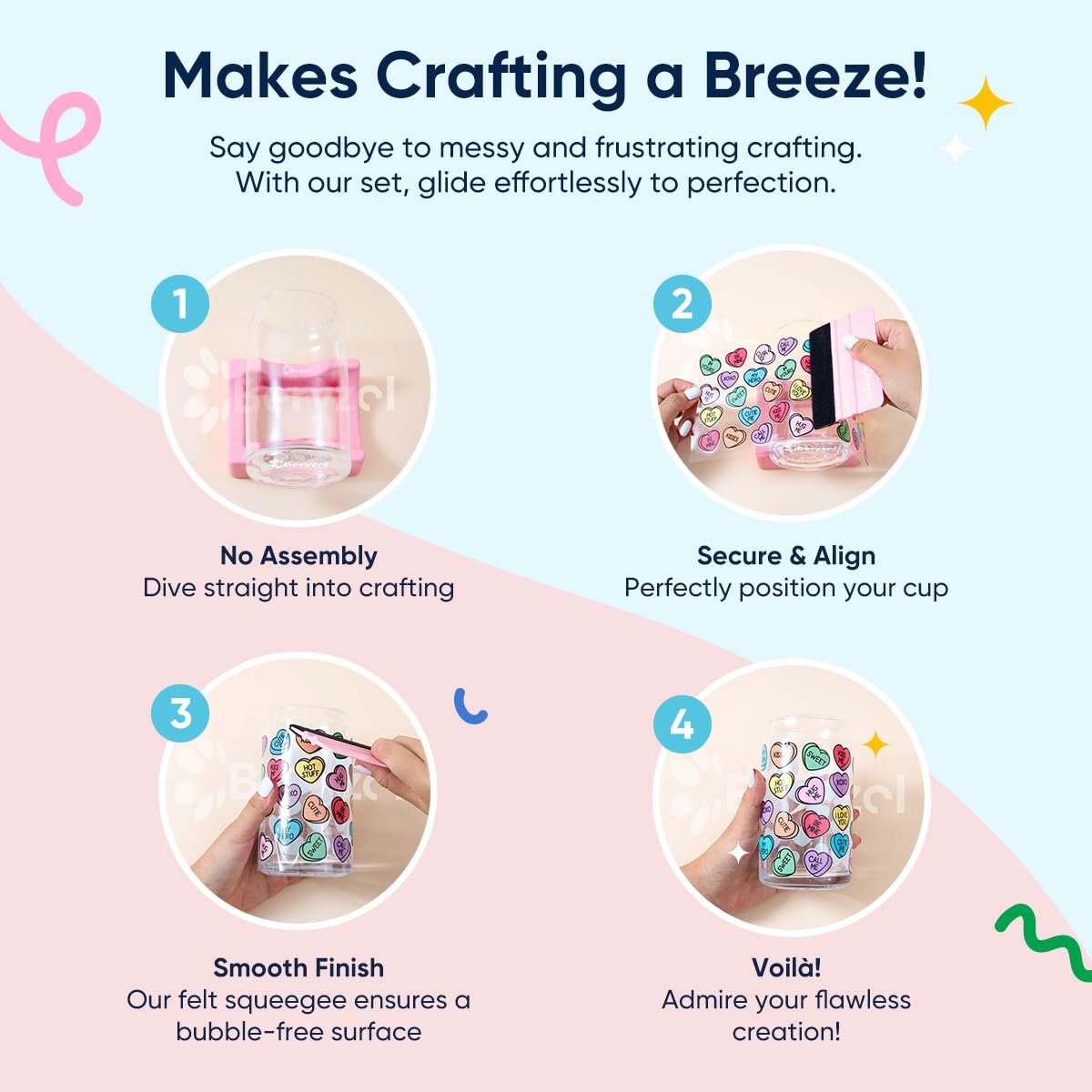 - Easy to Use: The steps of making crafts by using cup cradle set is simple:1. Place the prepared tumblers horizontally or vertically on the cradle. 2. Align the decals in correct position. 3.Squeeze out the air bubbles by attached felt squeeze. 4. Your DIY project is finishesd!