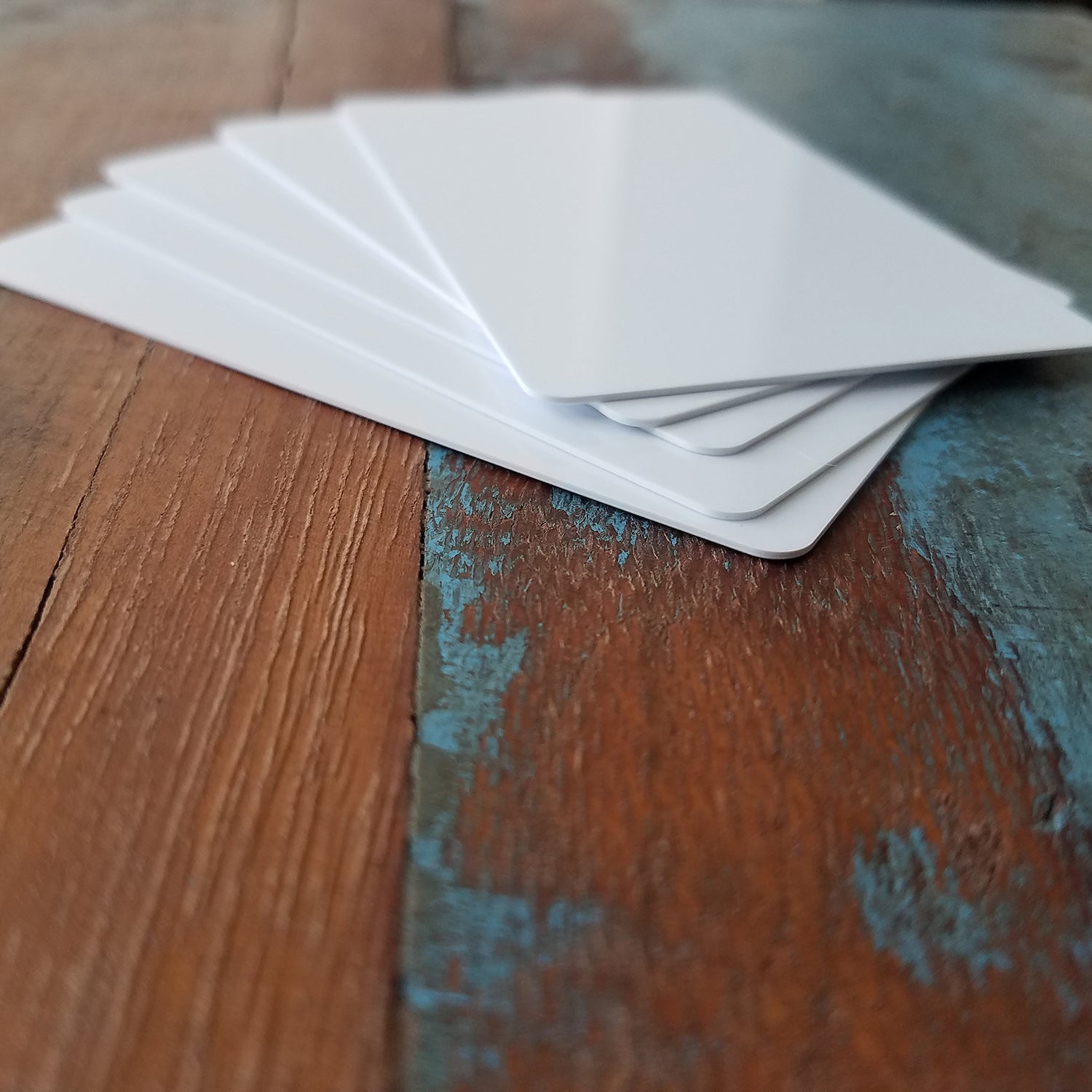 - 3 ⅜” (85mm) X 2 ⅛” (54mm) Sturdy and Economical - White Blank PVC Cards - Printable on Both Sides - No MagStripe - No Adhesive - No Pre-Punched Slots