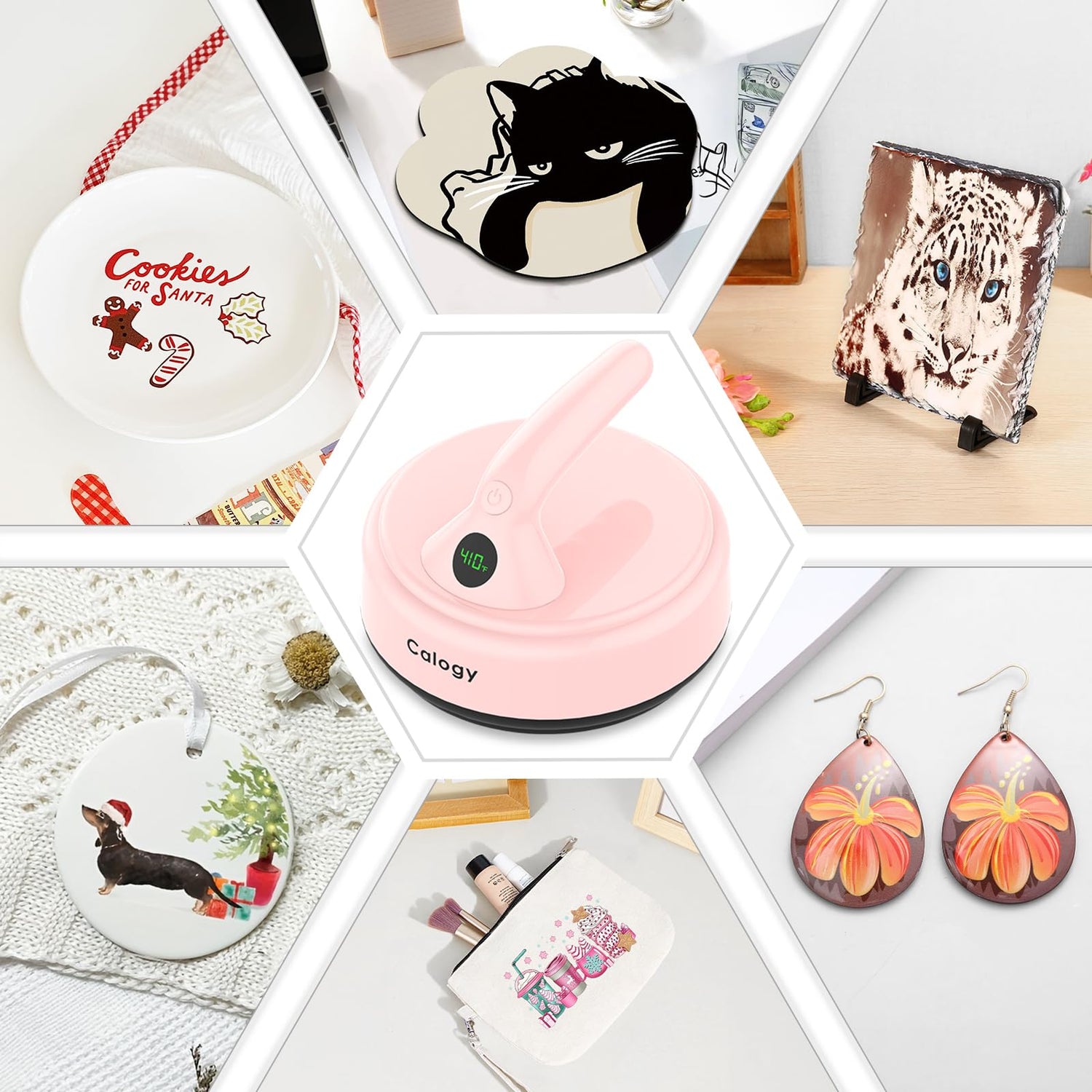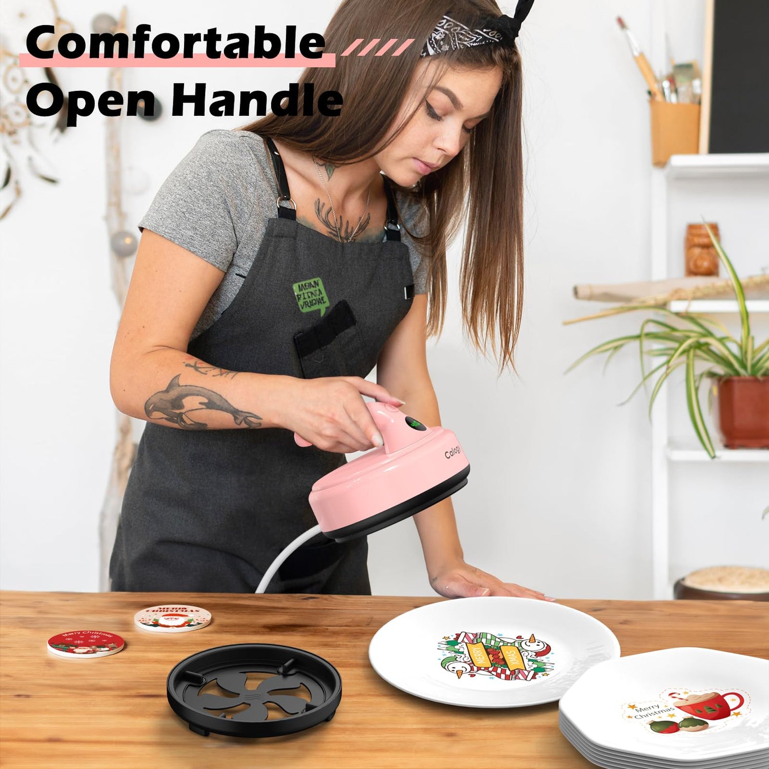 Calogy Mini Heat Press, 5" Diameter Circle Heat Press Machine for T-Shirt Portable, 4 Levels Temp Max 410℉, Small Iron for Crafts, Coaster, Bag, Pillow, Ceramic, Sublimation Ink Heat Transfer (Pink)
