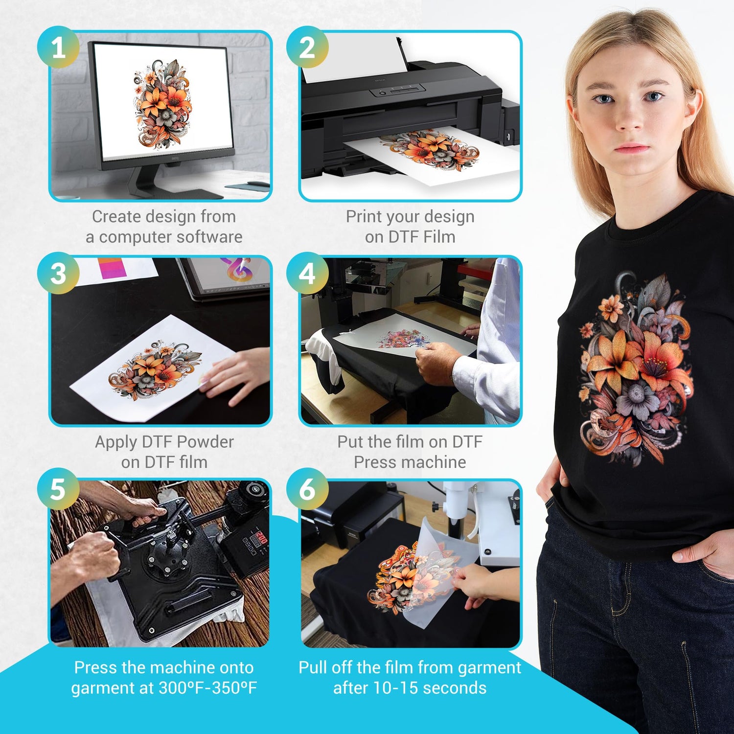 - All-in-1 DTF Starter Kit: This DTF transfer paper kit includes 15 sheets white DTF pretreat paper and 8.8oz white hot melt adhesive, all the necessary items for DTF printing. It is easy to use for home and commercial use.