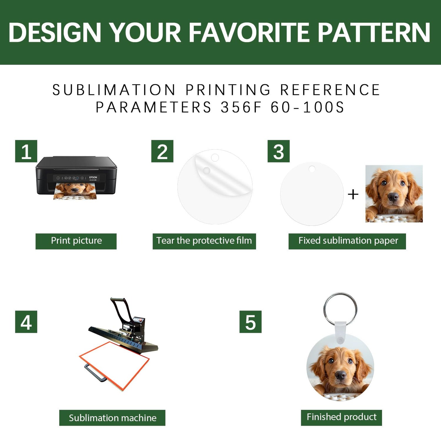 • 【Production and use】 Transfer the pattern for 50-60 seconds at 190-200℃(374-392℉). The above data is for reference only and subject to the actual situation. Note: There is a protective film on the surface of the Keychain. Please remove it before use. This is printed on both sides