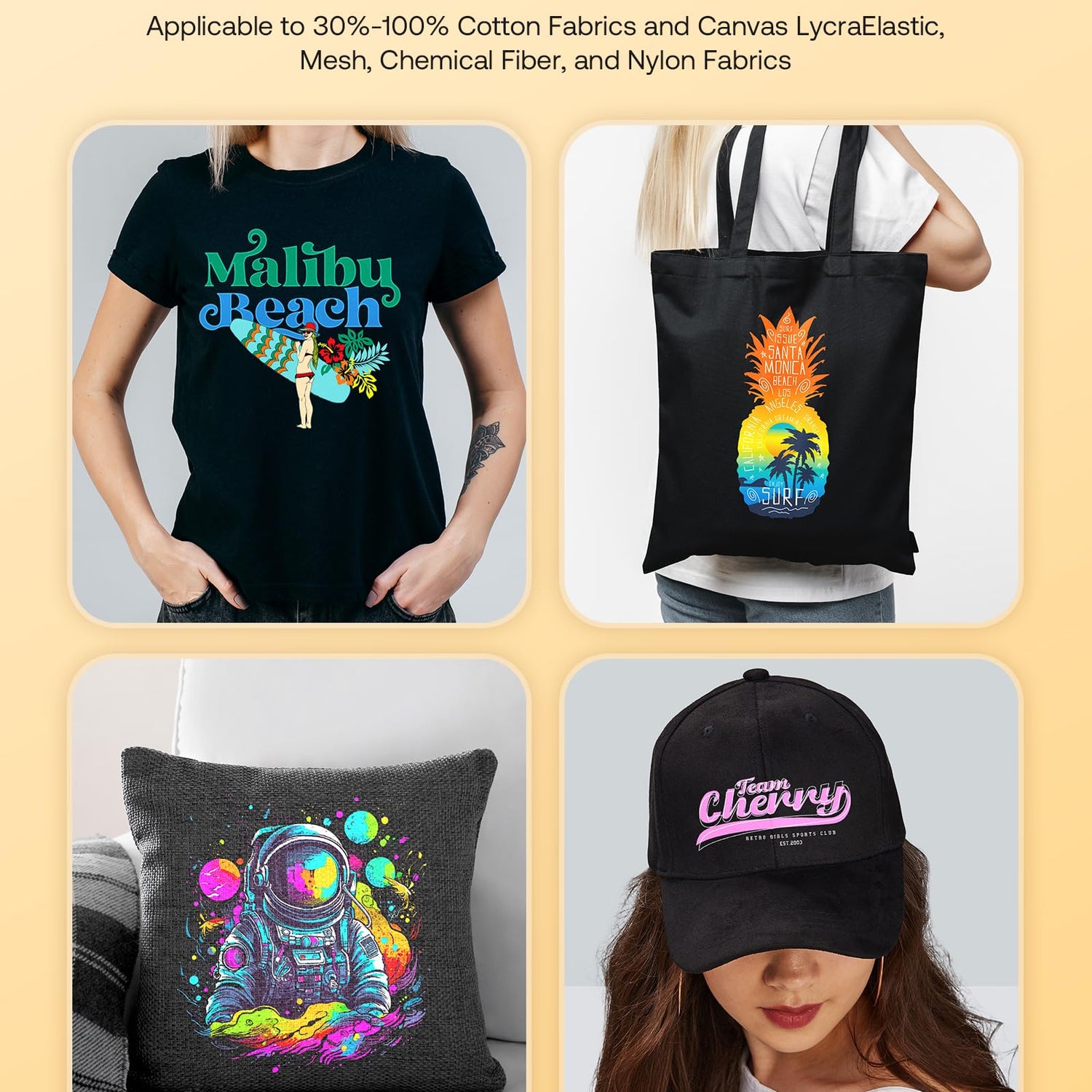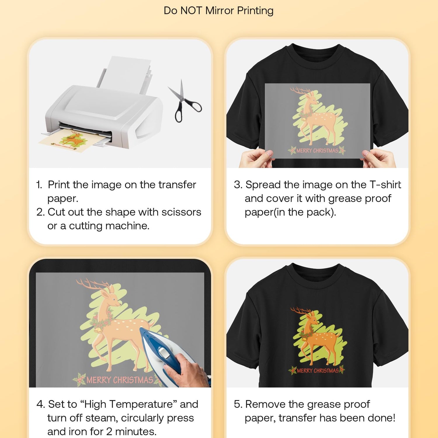 - 【Wide Applicability】 With this dark transfer paper, you can transfer text, images, photos, and pictures onto dark color 30%~100% cotton or nylon fabrics, such as T-shirts, hoodies, totes, canvas bags, aprons, masks, pillowcases, cushion covers, tablecloths, flags, and banners. Make unique DIY gifts to your friends or family on Mother's Day, Father's Day, Birthday, Thanksgiving, Easter, Halloween, Christmas, Valentine's Day, or Wedding Day.