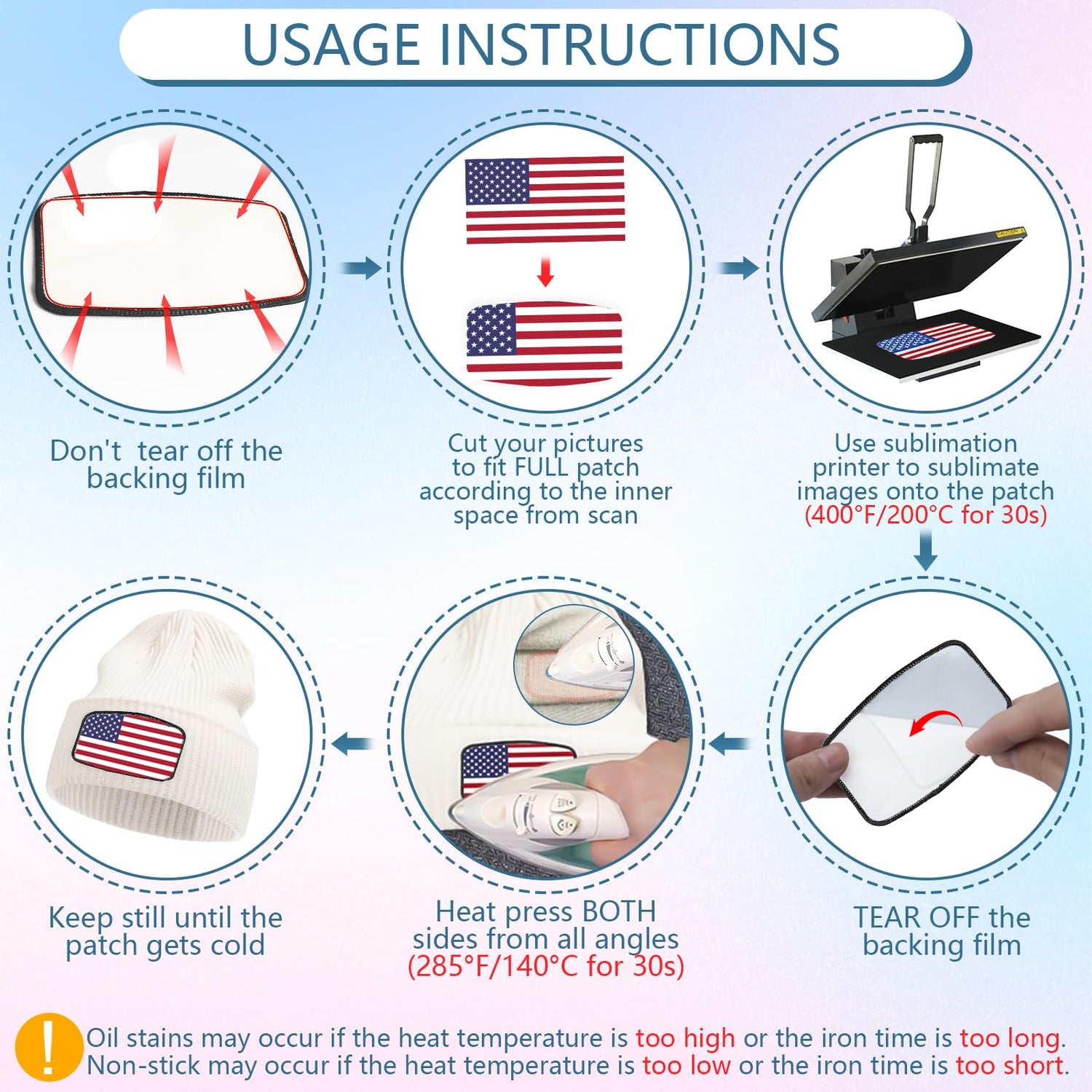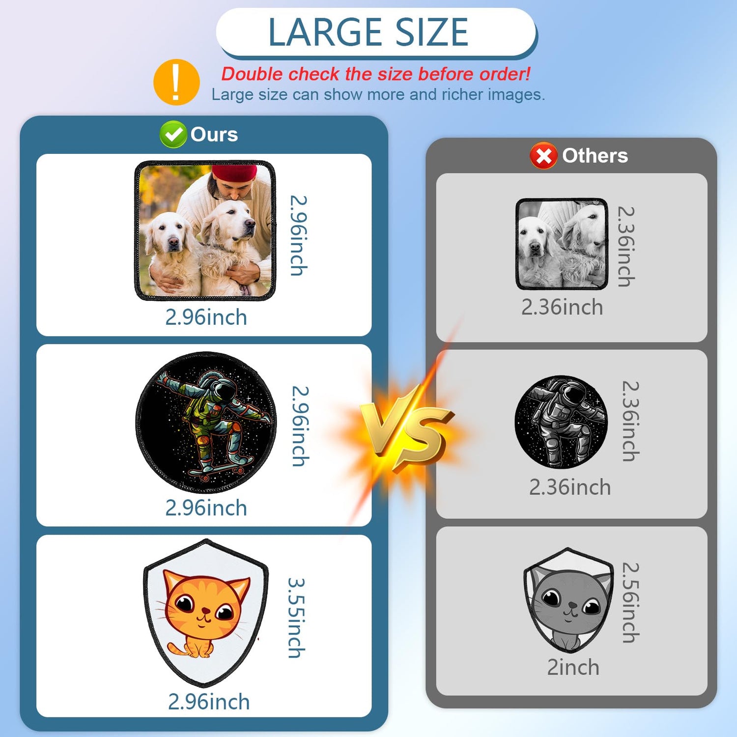 - ❤️EASY to SUBLIMATE & IRON ON - 1, scan the blank badges to get the inner space, cut your pictures to fit FULL patch, DON'T tear off the backing film, use the printer with sublimation ink to sublimate images onto the patch (400°F/200°C for 30s). 2, TEAR OFF the backing film, cover the FRONT patch with a fabric cloth, (285°F/140°C for 30s) heat press BOTH sides of the patch on your products from all angle, don't move it until it is cold