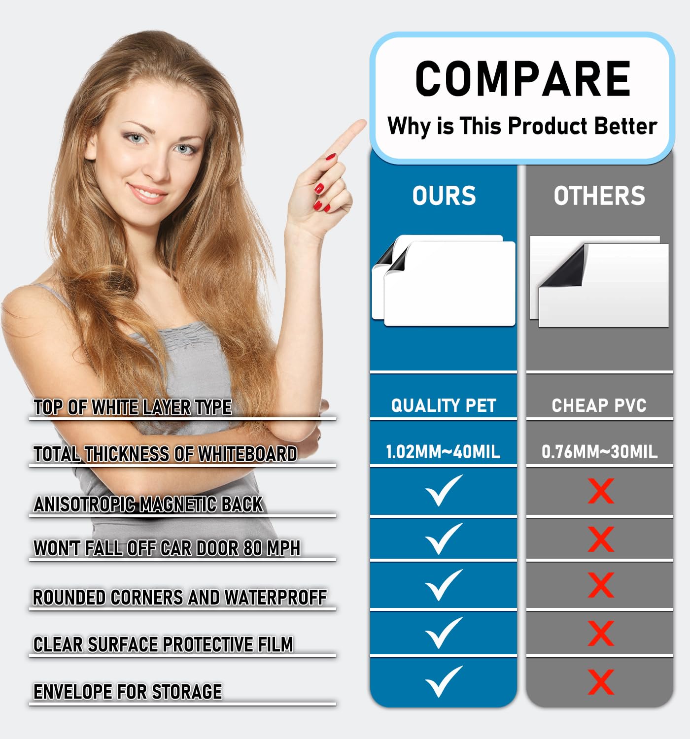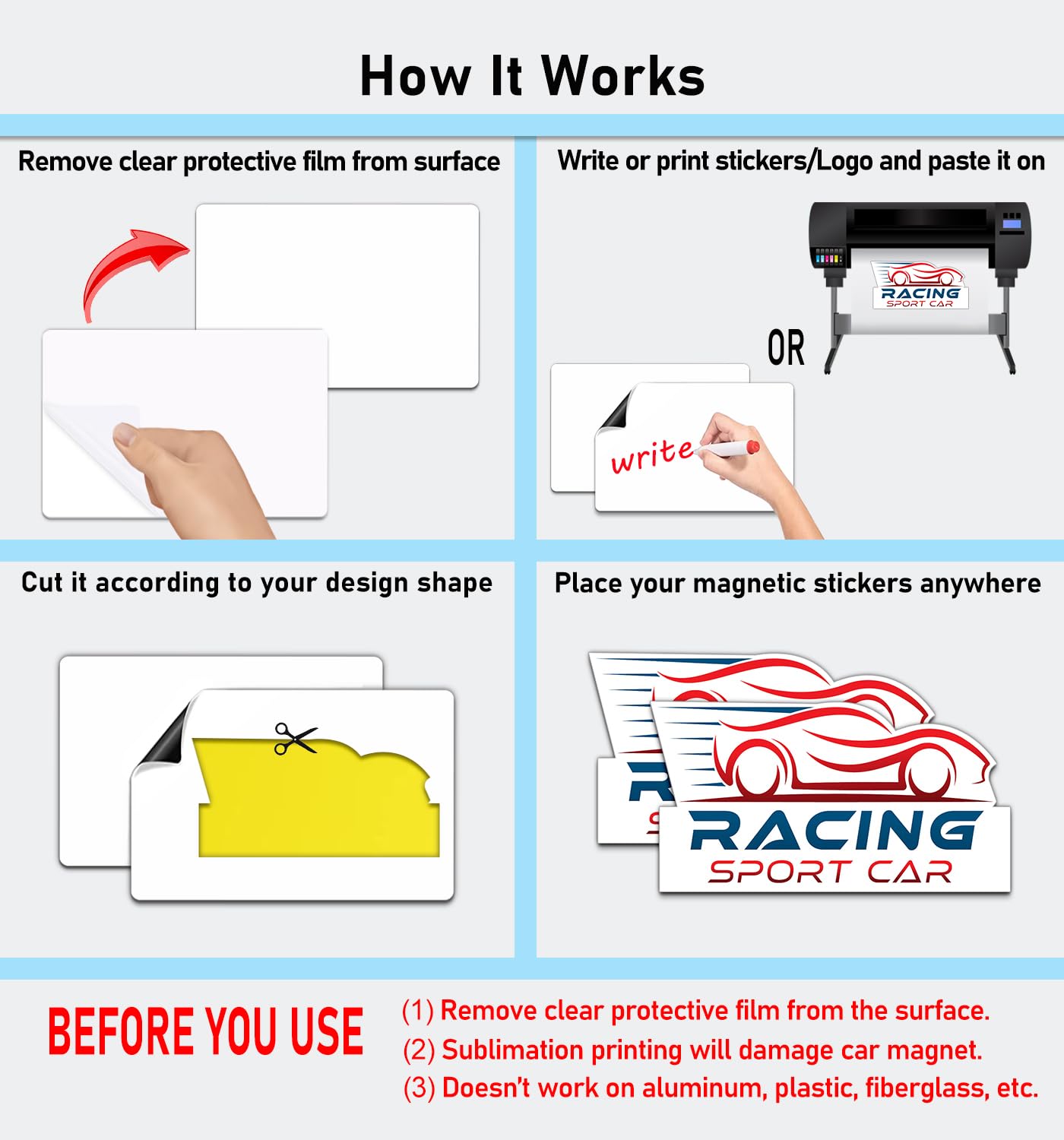 • 【Blank Car Magnets】Please check if your car door is attracted by magnets and Remove the clear protective film from white surface, set of (2) 17” x 12” magnetic signs for vehicles. Car magnet blank is 40-mil thickness. With stronger magnetism, there is no need to worry about being blown away on the highway. You can write or print your business on the magnetic stickers for car door.