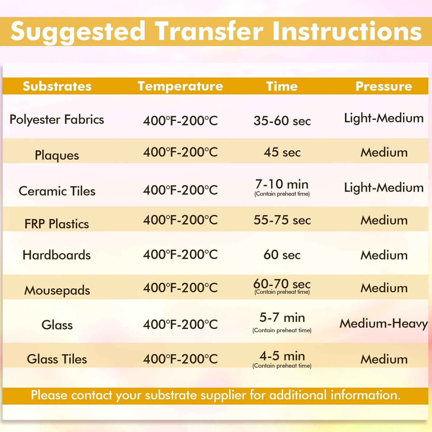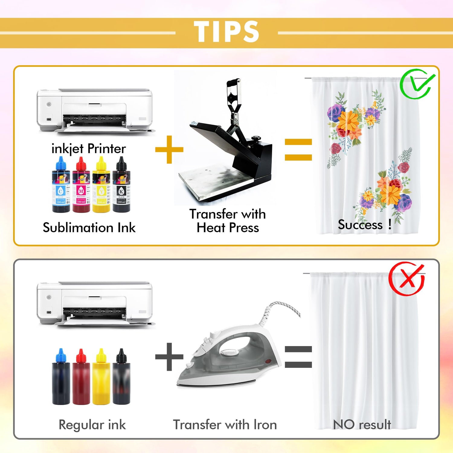 • 【Important Usage Tips】ISuitable for light-colored polyester fabrics, polyester-coated items, and materials with ≤ 30% cotton content. Only use sublimation ink; regular ink will not work. Perform a sublimation test and check color results before adjusting settings.