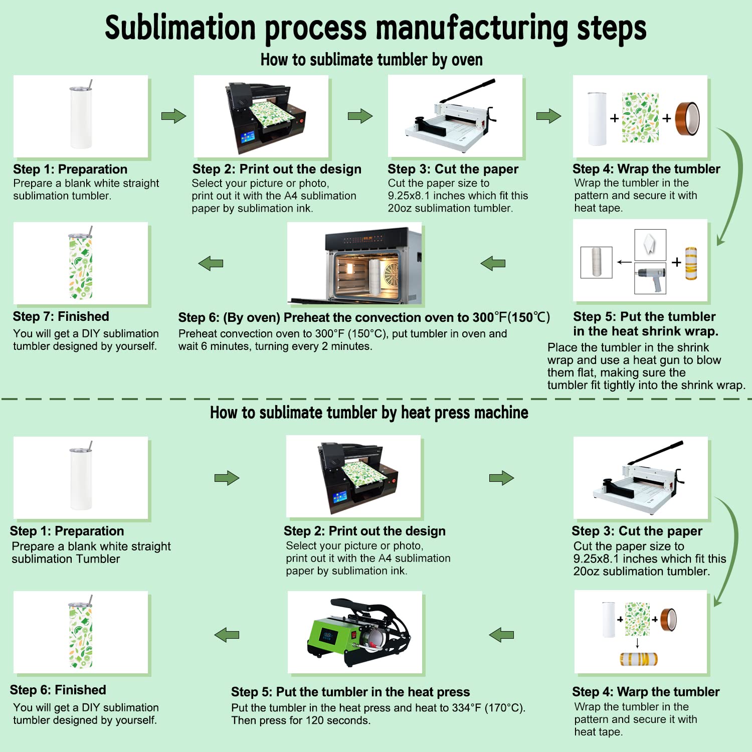 • 2 Ways to Sublimate Tumbler: If you choose the heat press machine to sublimate the tumbler, the recommended time is 60 seconds and the recommended temperature is 334 ℉. If you choose the oven to sublimate the tumbler, the recommend time is 6 minutes and the recommended temperature is 300 ℉.