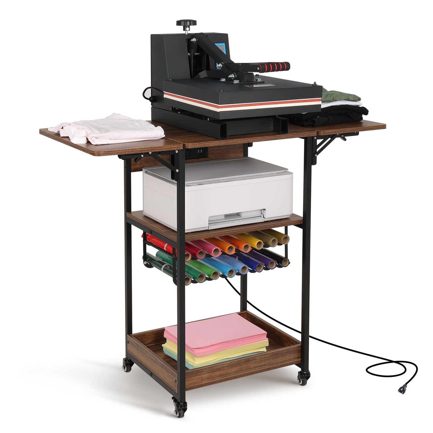 Kokorona Heat Press Table Stand with Vinyl Roll Holder & Charging Station, 3 Tier Heavy Duty Heat Transfer Machine Stand for Sublimation Print, Movable Rolling Metal Workbench with Folding Shelf