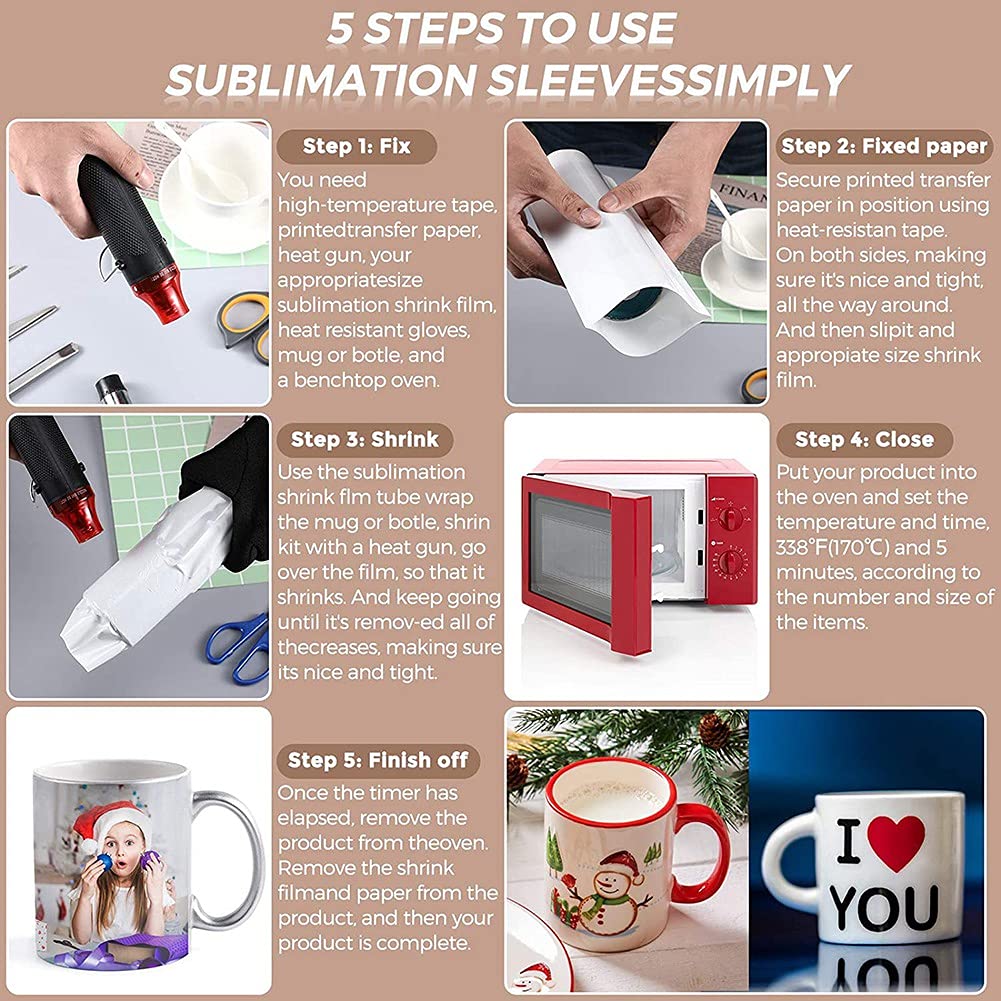 - Effortless to use: you can make DIY with shrink wrap sheet on your own for it is simple to use; Just cover the mug or other sublimation blank with sublimation shrink wrap, and then place them into the oven, next is to set time and wait the finished products about 380°F(193℃) for about 8 minutes