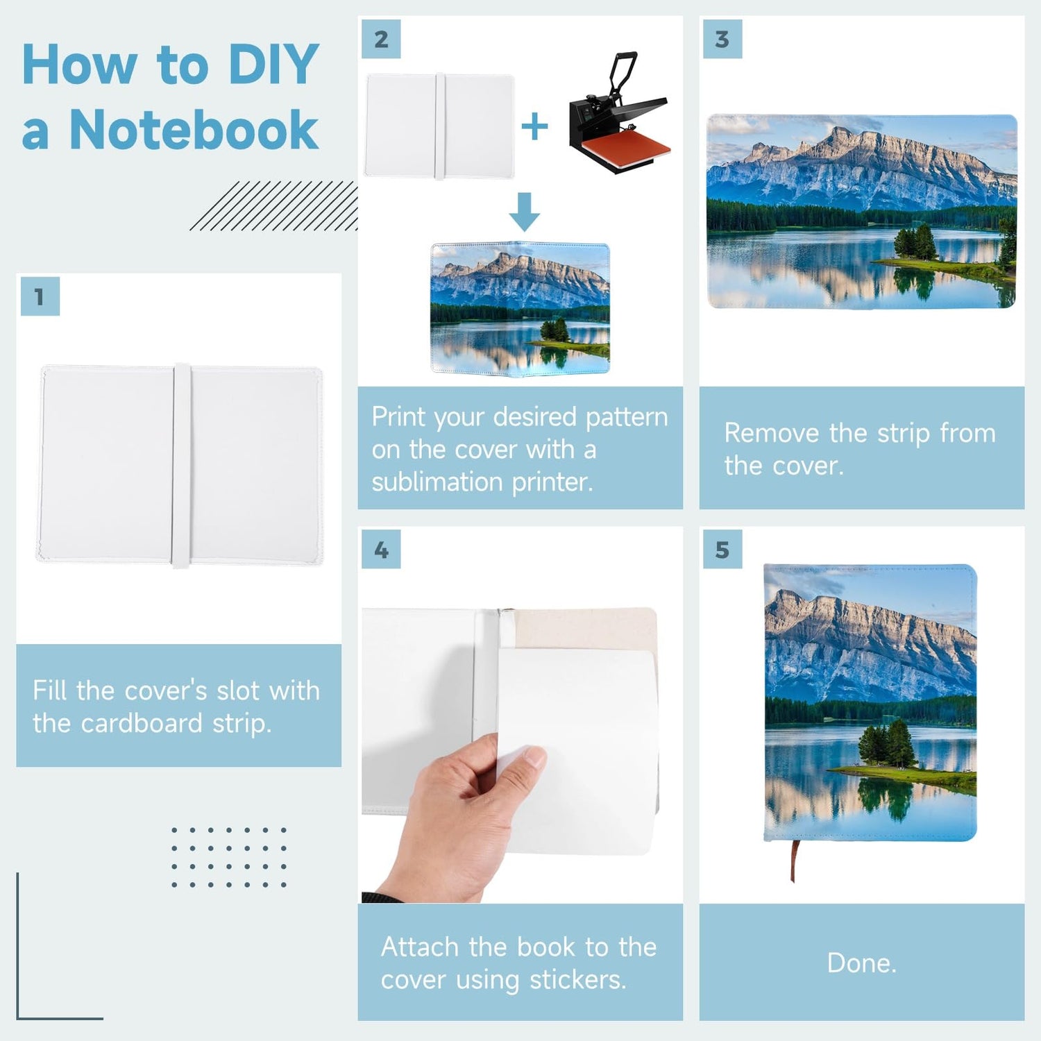 - 【Effortless Personalization】Each journal comes with a cardboard strip and 2 double-sided adhesive stickers for easy setup. First, fill the cover's center slot with the strip; then, put the cover into a heat transfer machine to apply your desired design; last, remove the strip and attach the notebook to the cover using the stickers.