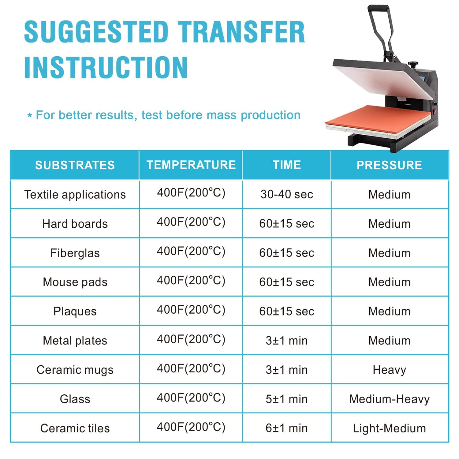 - Seamless Printing Experience: User-friendly design with a white blank side for printing and a non-printable character side. Mirror print the image, set the temperature and time, and transfer using an ironing machine or baking cup machine