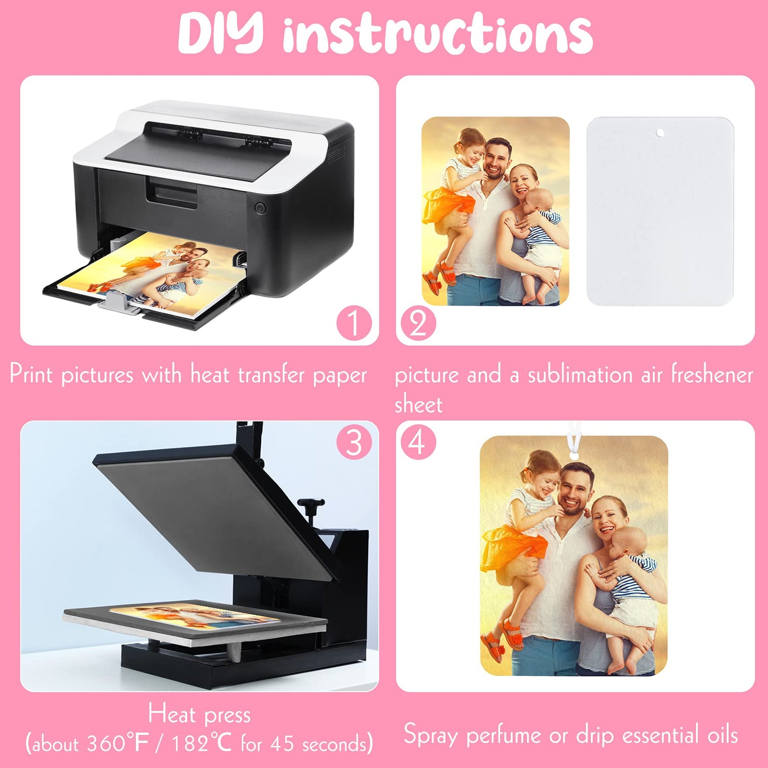 2.When using the heat press, too high temperature may make the air freshener sheets turn yellow. It is recommended to use about 360℉ / 182℃ for 45 seconds.