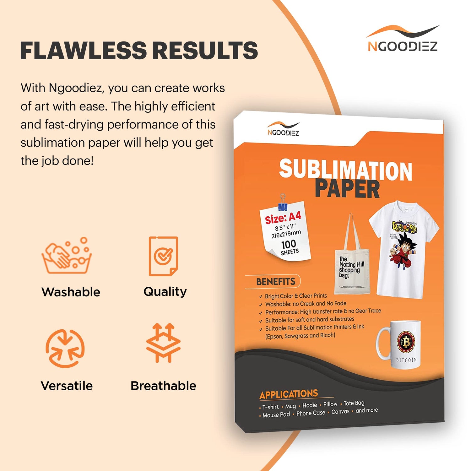 NGOODIEZ Sublimation Paper for Cotton Polyester T Shirt Fabric, Mugs, Wood, Canvas, & More, Paper for Printer Compatible w/Any Inkjet Printer w/Sublimation Ink, 100 A4 Sublimation Paper 8.5 x 11