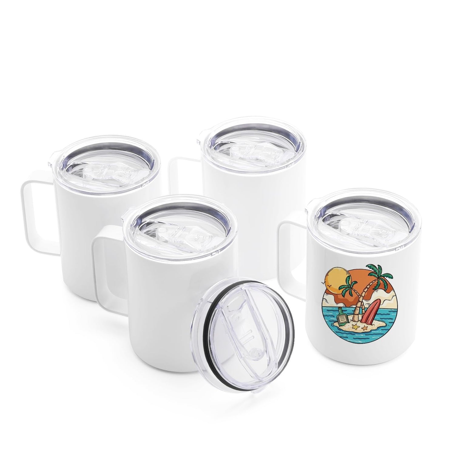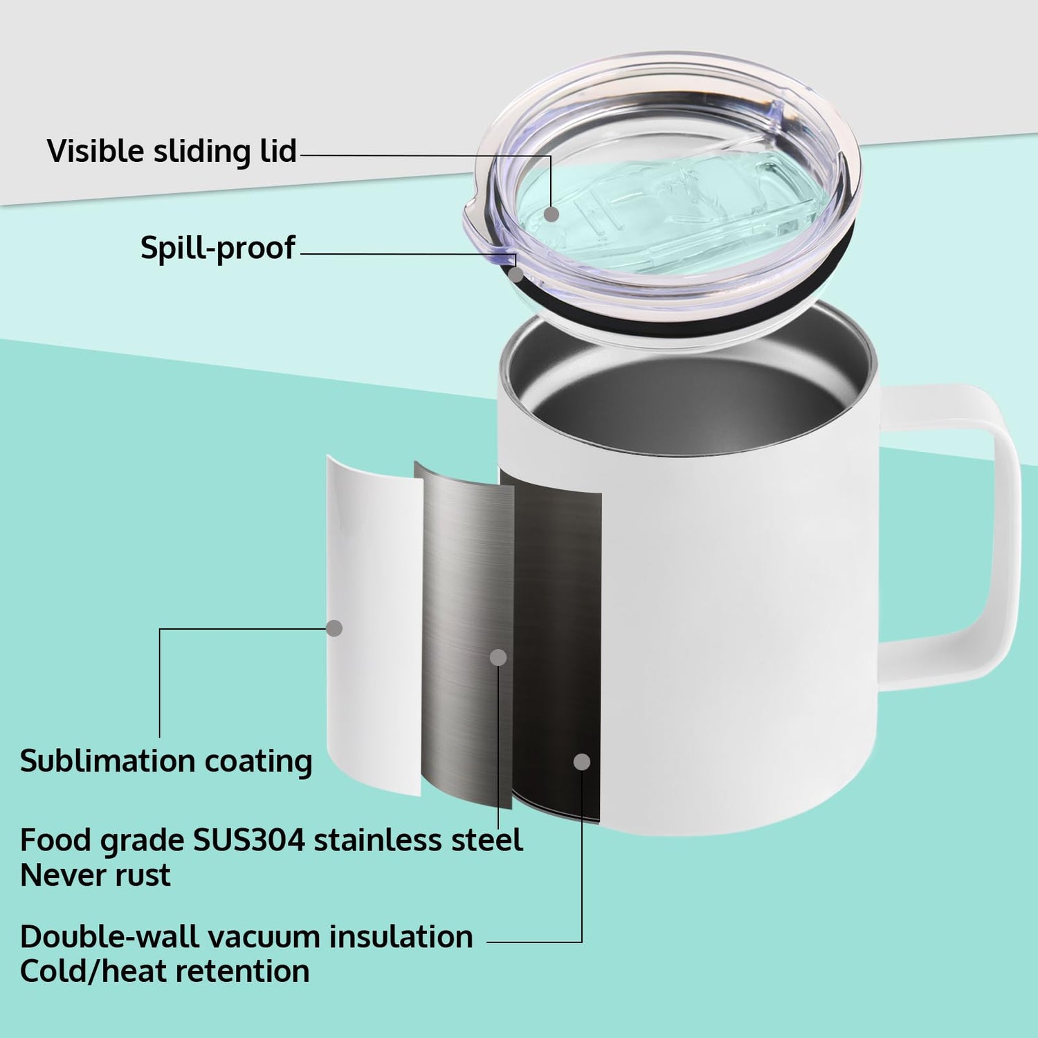 • ๐Ÿ“ฆ Package: The set includes 4 pieces of 12 oz sublimation blank stainless steel mugs. Each one is equipped with a handle and sliding Lid, and packed with a protective bubble bag.