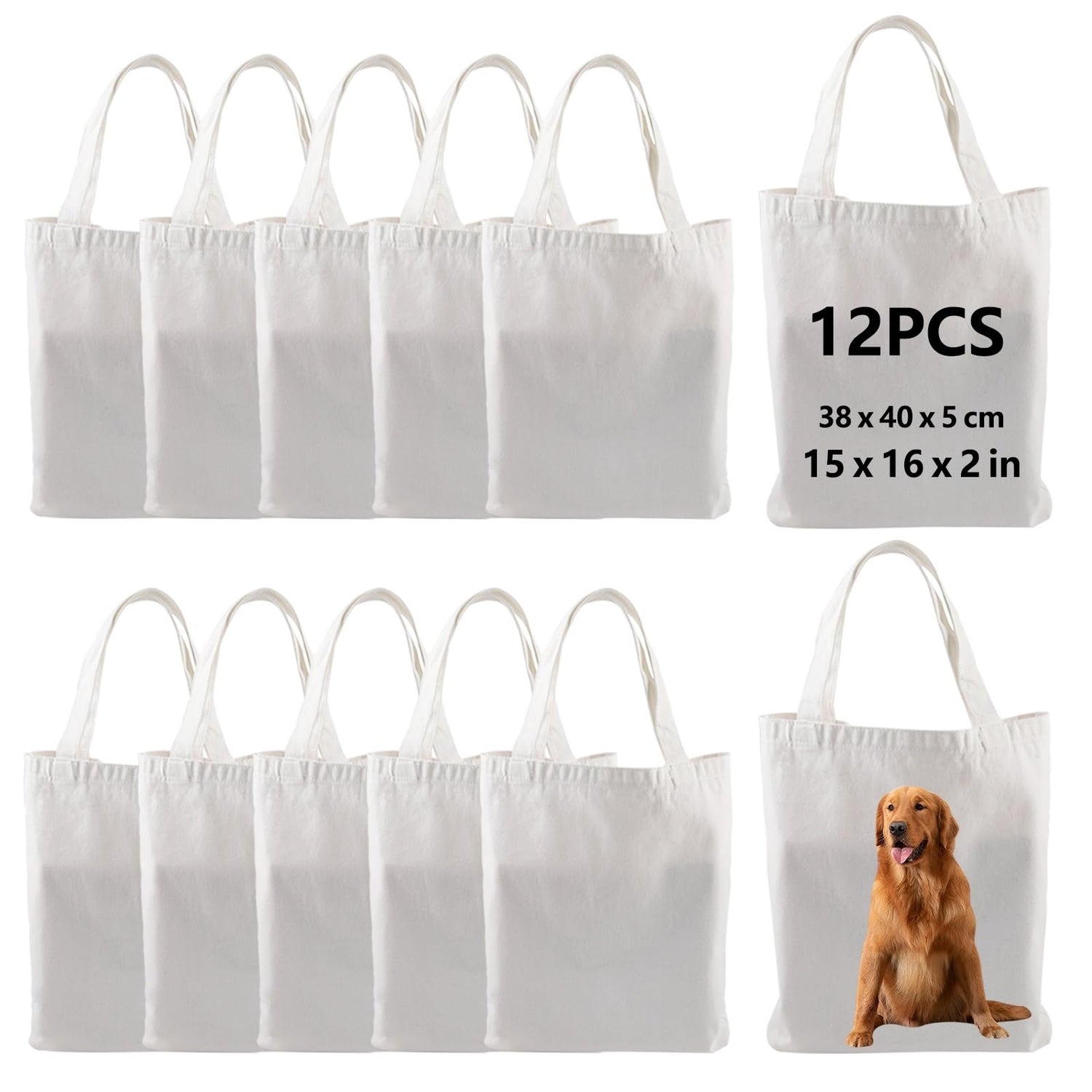12 pcs Off-white blank canvas Sublimation Tote Bags, Product size :15*16*2 inches (38*40*5cm);Fabrication Process Blank Canvas bags are ideal for heat transfer vinyl, screen printing, embroidery, fabric painting and personalized craft uses. Also allow you and your children to create their own paintings to show artistic imagination.
