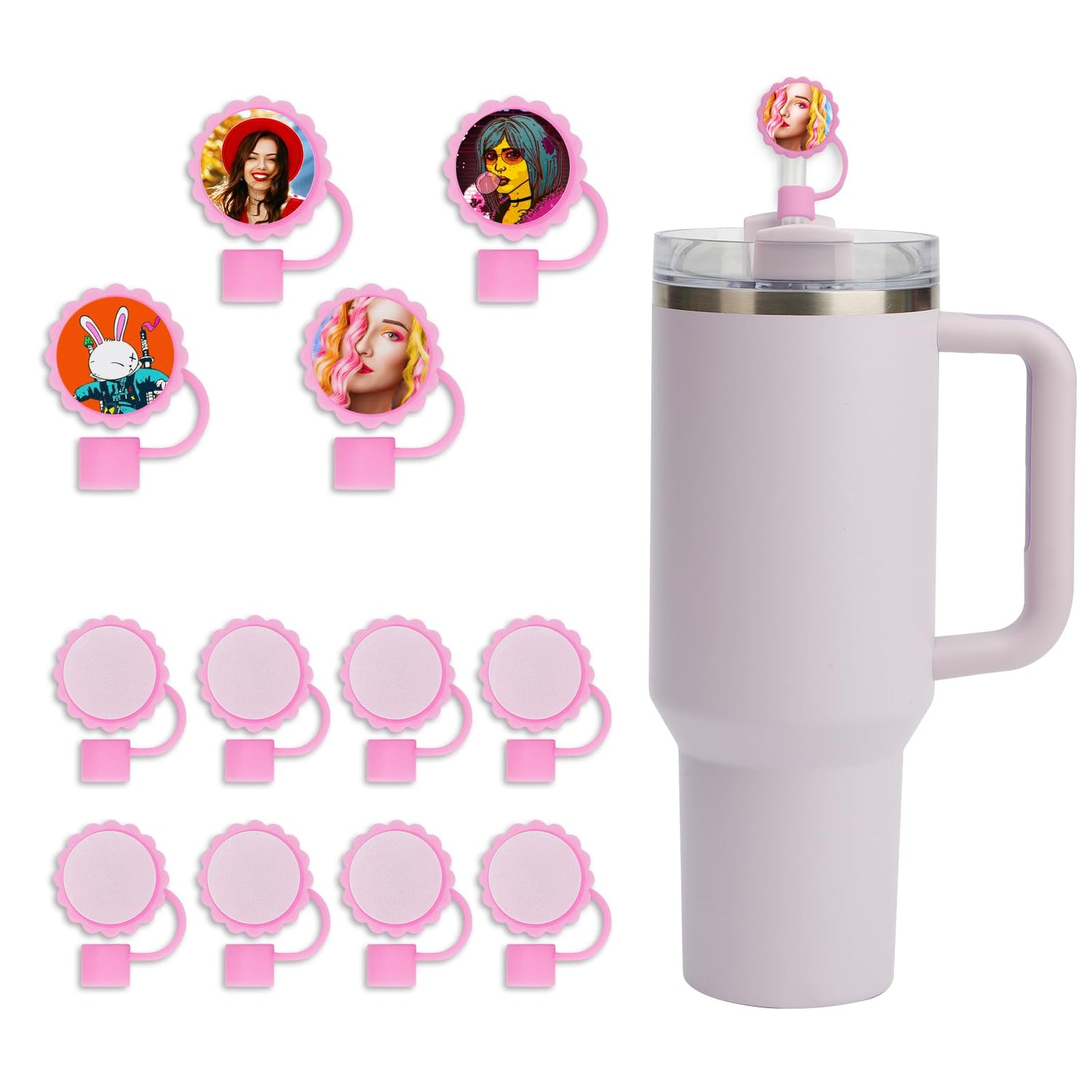 PYD Life 12 Pack Sublimation Straw Cover Cap Topper Silicone Pink for 40 OZ 30 OZ 20 OZ Stanley Tumbler Cup 10mm Straws 1.18" Flower Round with 1" Sublimation Blanks Aluminum Round Sheets
