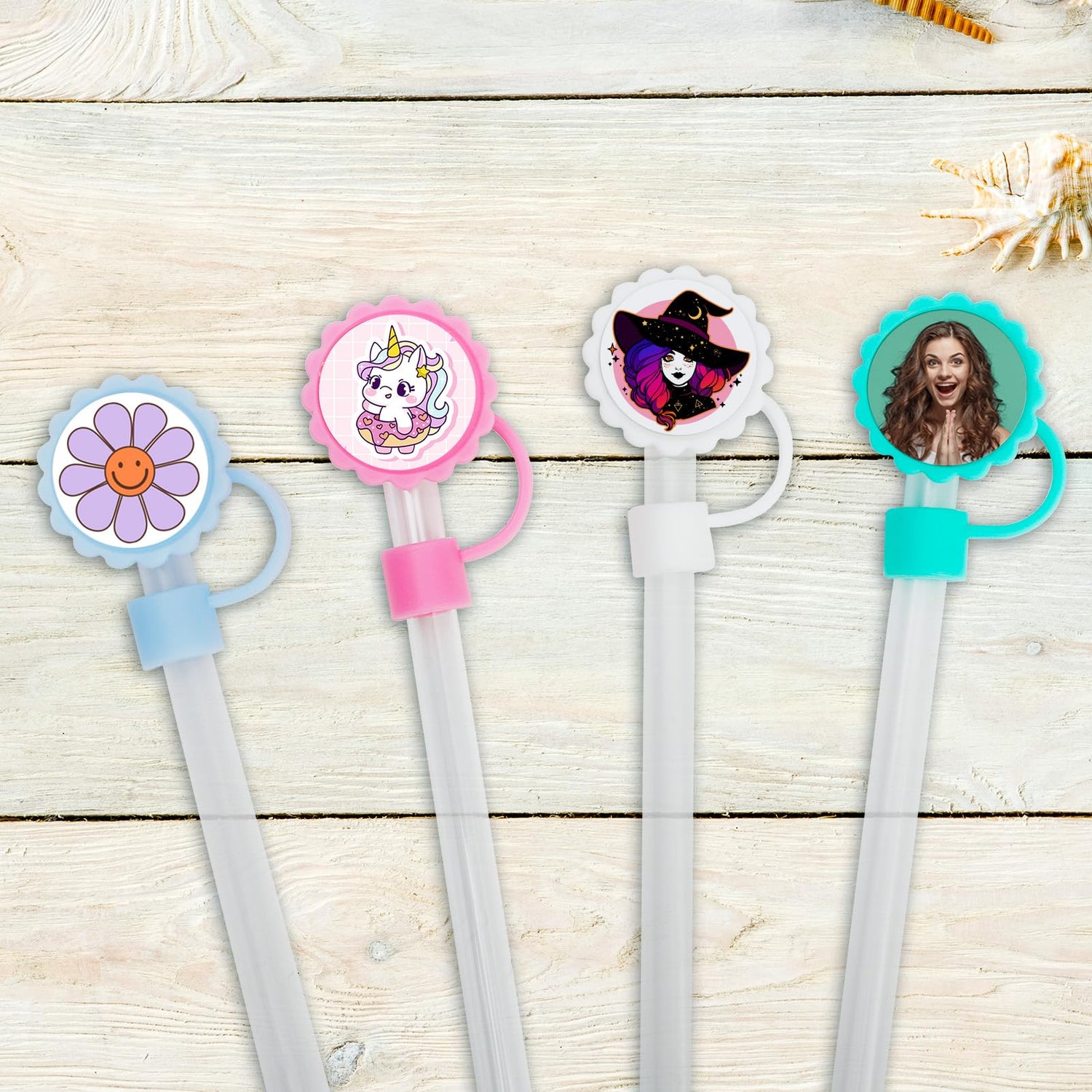 • Food Grade Materials:The straw covers toppers made of soft food grade silicone,cut flower shapes.The flower silicone with stickers,then you can stick the printed aluminum sheets on it.Make your straw cover cap unique.