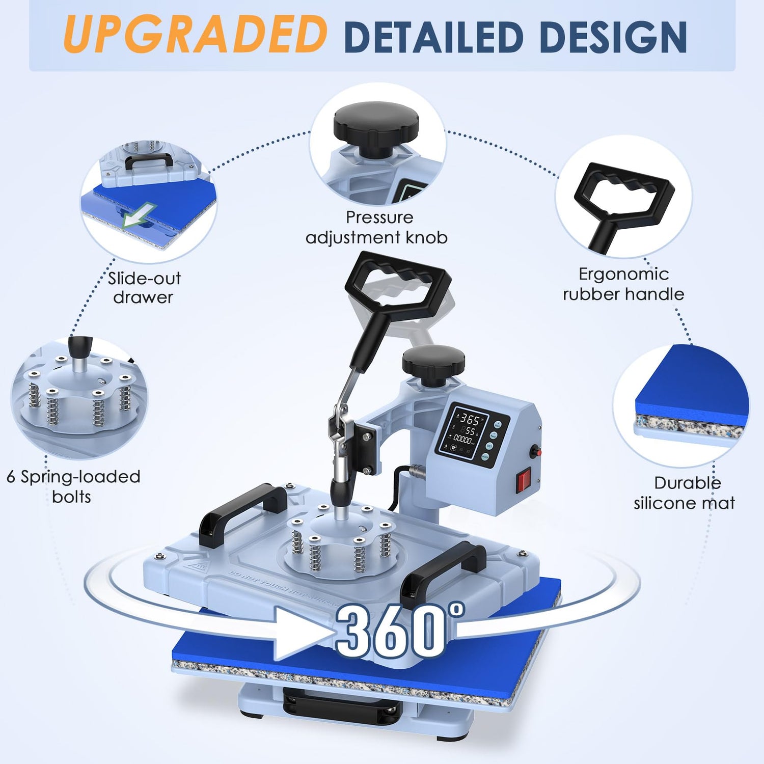 - Heat press vinyl machine with full range pressure, via adjustment knob, can be adjusted according to the thickness of material.