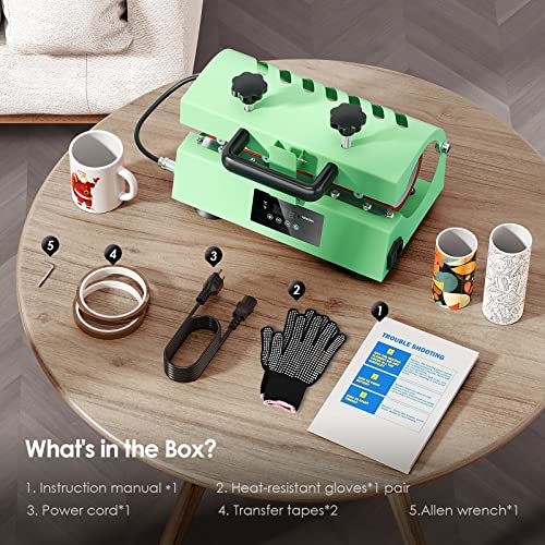 • ✔【 Guaranteed High Quality 】Our mug press sublimation machine prioritizes your convenience and safety in our design. Adjust pressure and diameter smoothly with our pressure knob, while our built-in fuse ensures a Sturdy and secure operation. We stand by our quality with a 12-month warranty and 24 hours customer service. Dive into the world of effortless customization with us!