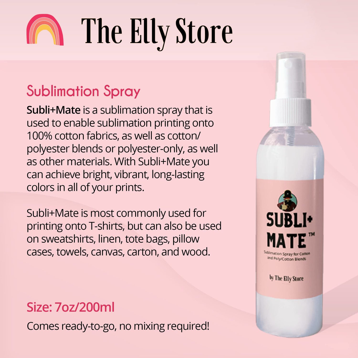 Details: SUBLI-MATE Sublimation spray + Fade Stopper Combo pack for Cotton and Cotton/Polyester fabrics. Achieve brighter and more vibrant colors. Easy to use-no mixing.Polycrylic-FREE No diluting necessary, spray is ready to use. Use Subli+Mate spray for your printing and Fade Stopper before you wash . Fade Stopper will help retain colors through washing.Spray fabric one time before washing. Wash immediately or later without detergent for initial wash. **not compatible with Hippoo ink. We recommend testing first if your print contains more than 30% black or you are using a different brand sublimation spray**