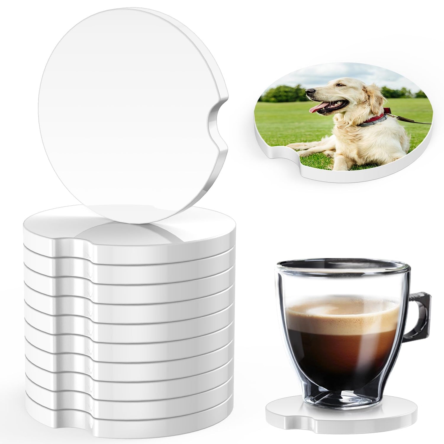 Sublimation Blanks Car Coasters, 12pcs Absorbent Ceramic Car Cupholder Coasters with A Finger Notch for Easy Removal, Keep Vehicle Free from Cold Drink Sweat, Stain and Spill