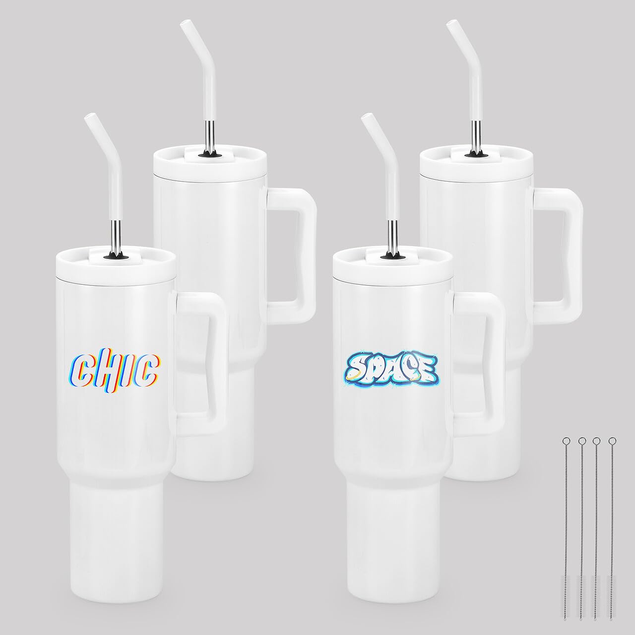 Sublimation Tumblers, 4 Pack 40oz Insulated Tumbler, 100% Leak Proof, with Handle & Lid & Straw & Brush, Stainless Steel Iced Coffee Tumbler Bulk, DIY Gift for Women Men Travel Party Car Office, White