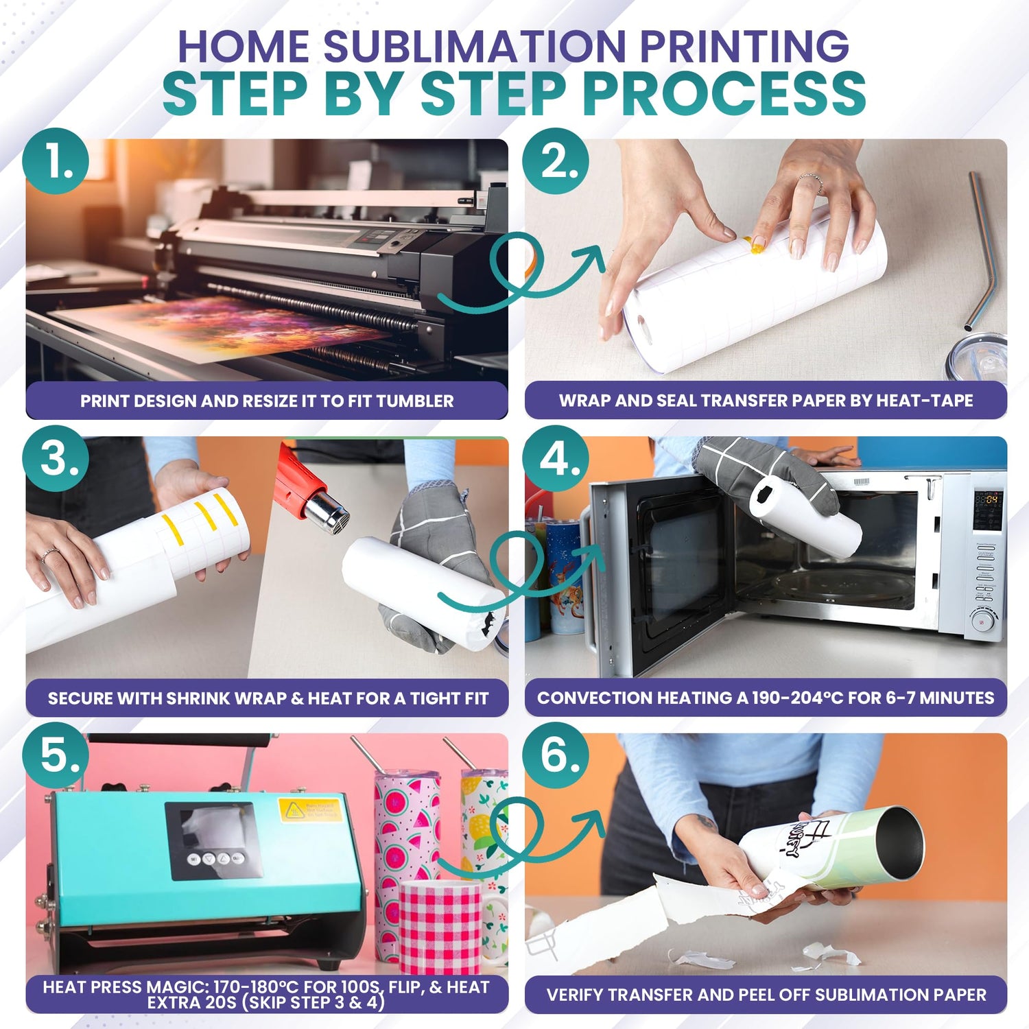 - CUSTOMIZATION PROCESS: Wrap sublimation sheet on tumbler entirely from top to bottom with heat tape. Cover it with shrink wrap. It can be heated in a convection oven or heat press. Suggested temperature for Convection oven is 347 Fahrenheit for 4 mins approximately, and for heat press 356 Fahrenheit for 100 seconds then turn around and 20 sec more.