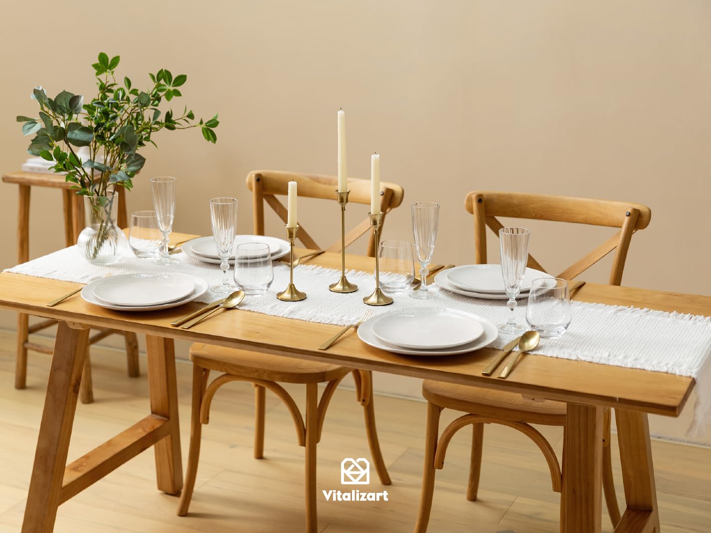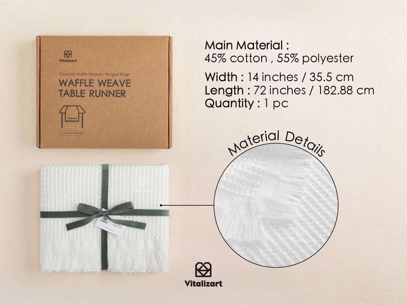 Vitalizart White Table Runner 14"x72" Waffle Weave Boho Rustic Fringe Cotton Farmhouse Table Cloth for Home Decor Coffee Table Bedroom Kitchen Dining Bridal Wedding Baby Shower Decoration