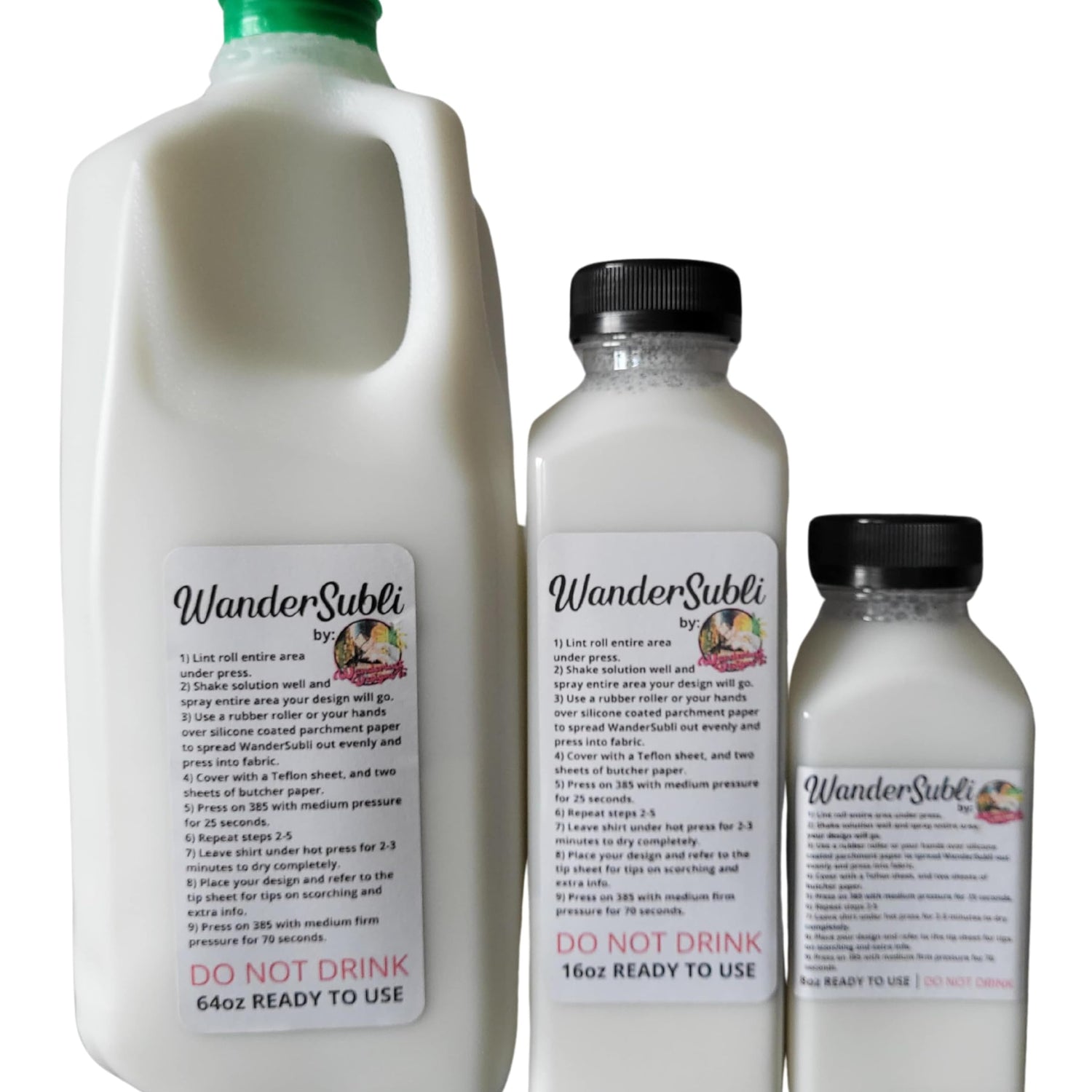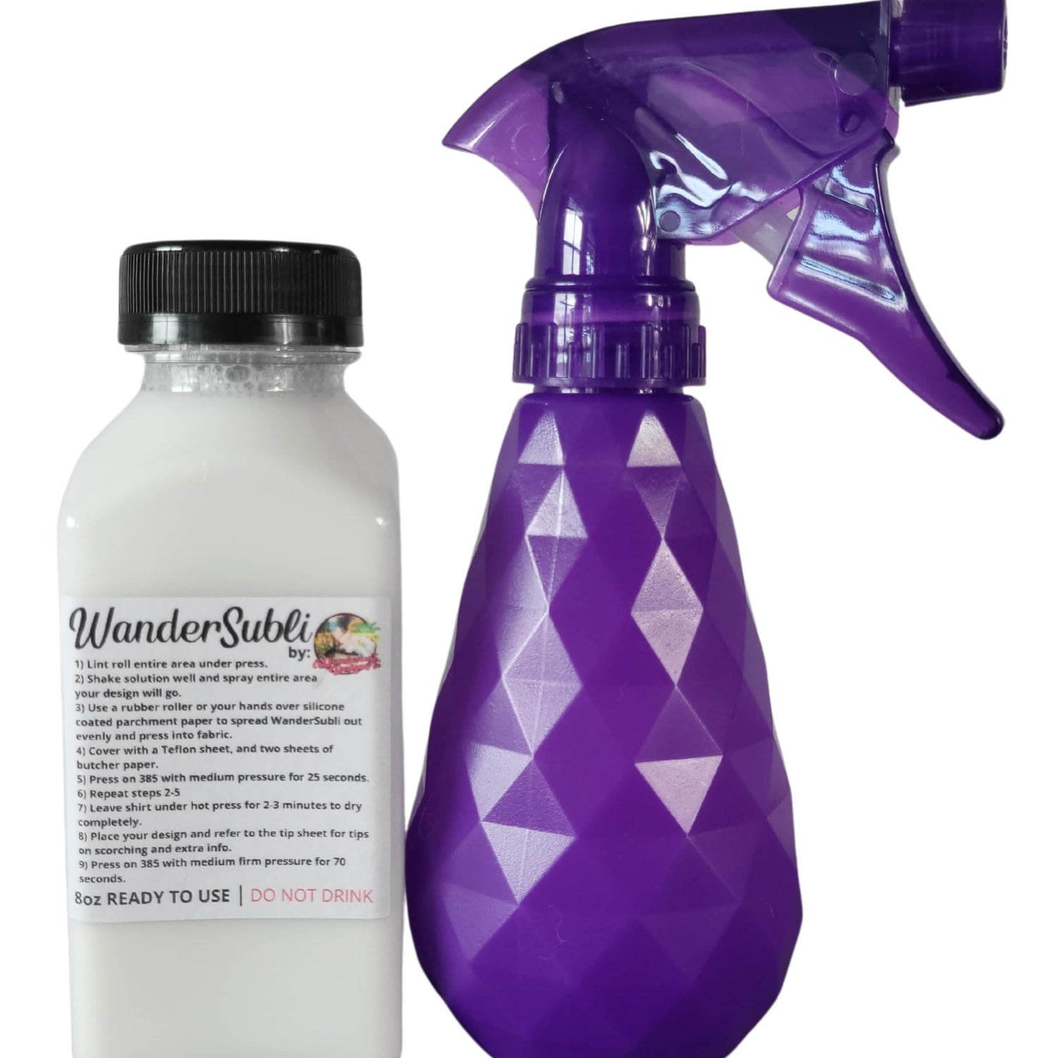 Details: Get brighter, more vibrant long lasting images with WanderSubli! A super simple, non-toxic fabric spray to use on items that are not 100% polyester. WanderSubli is non-toxic, VOC free, and has been rigorously tested for quality and safety. All orders come with a fine mist spray bottle.