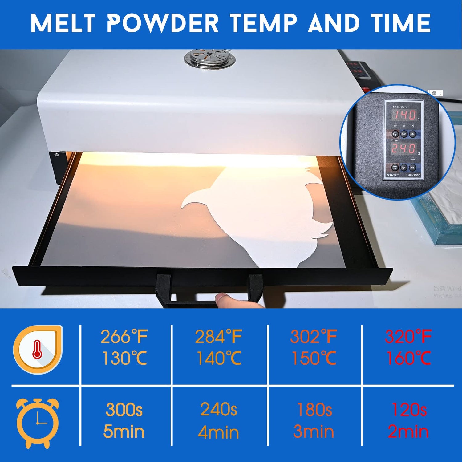 - 【Bright Colors and Vivid Pattern】Our DTF Pretreat Powder has a higher hot melting temp which is within 266℉-284℉ while melting time is supposed to between 2min-5min. Thus, the printings on the DTF PET film and garments won't apear spot or shrinkage cavity that make the pattern more shiny and glorious.
