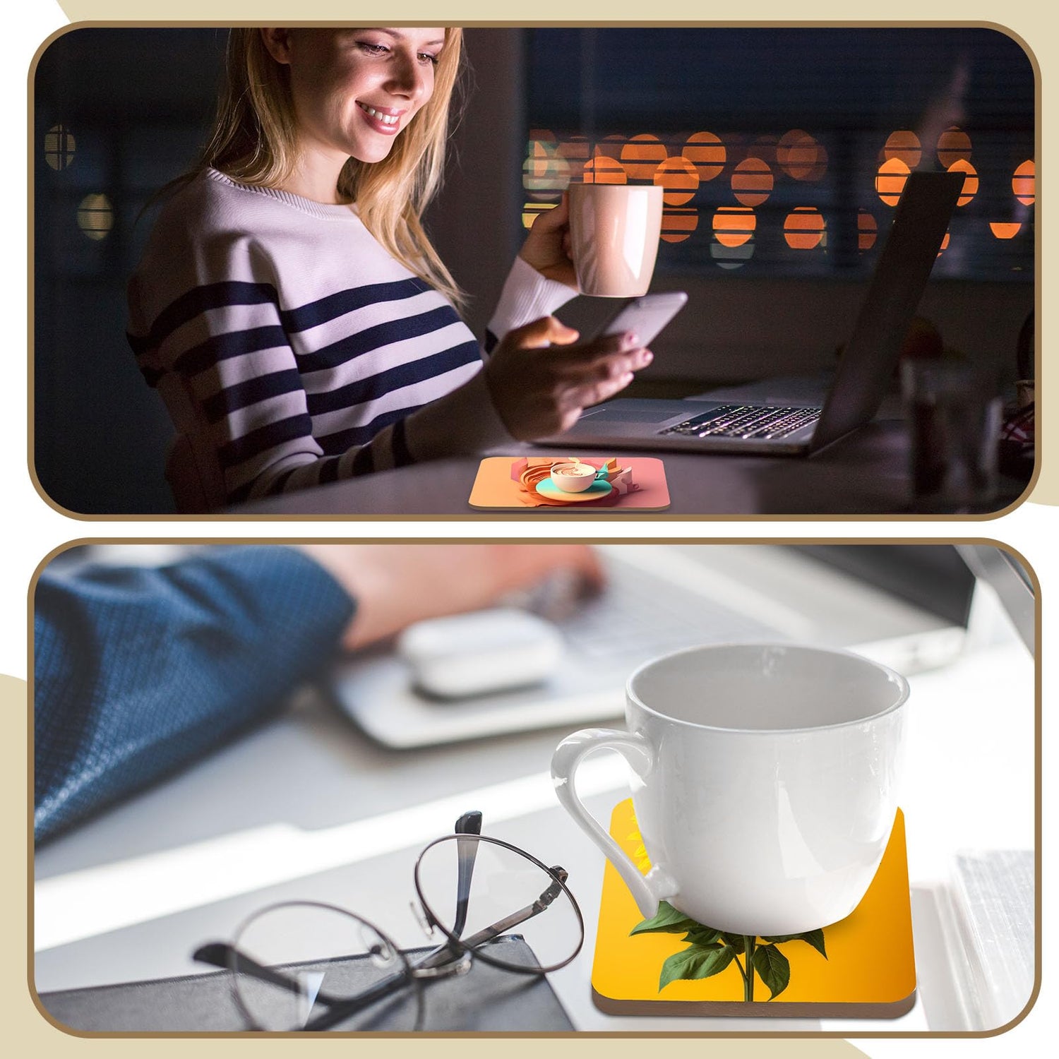 These cup coasters are masterfully crafted from MDF that is coated with a sublimation coating. Moreover, the coasters come with a cork backing that helps protect your furniture from hot or cold beverages. The color of the coasters is as depicted in the image, adding a touch of elegance to your decoration.