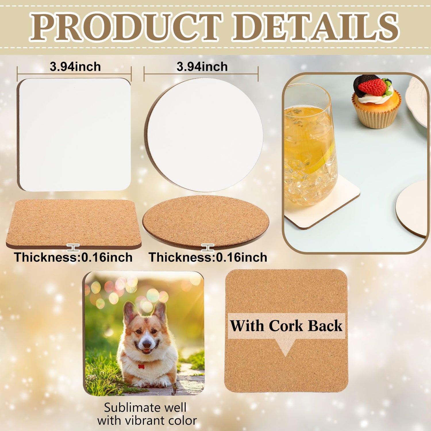 Ziliny 24 Pcs Sublimation Coasters 4 x 4 Inch Hardboard Coaster Cork and MDF Blank Coasters Sublimation Car Coasters Heat Press Parts Accessories for Kitchen Drink Ornaments (Round,Square)