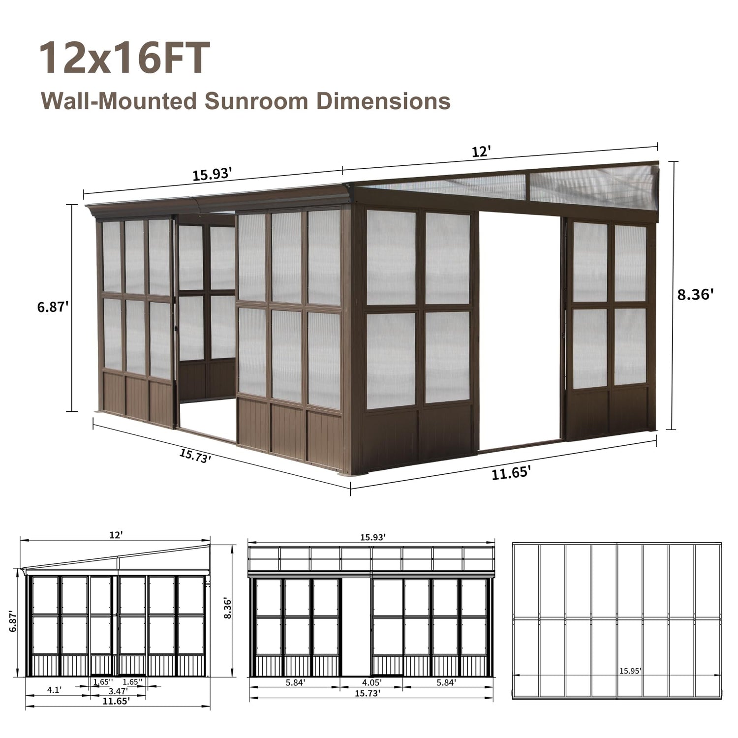 • Generous Interior Space- Step into your own spacious sanctuary with the Domi wall-mounted sunroom. It offers a spacious area measuring 15.93’L x 11.65’W x 8.36’H, creating an expansive area for you to unwind, entertain, or simply bask in the natural light.