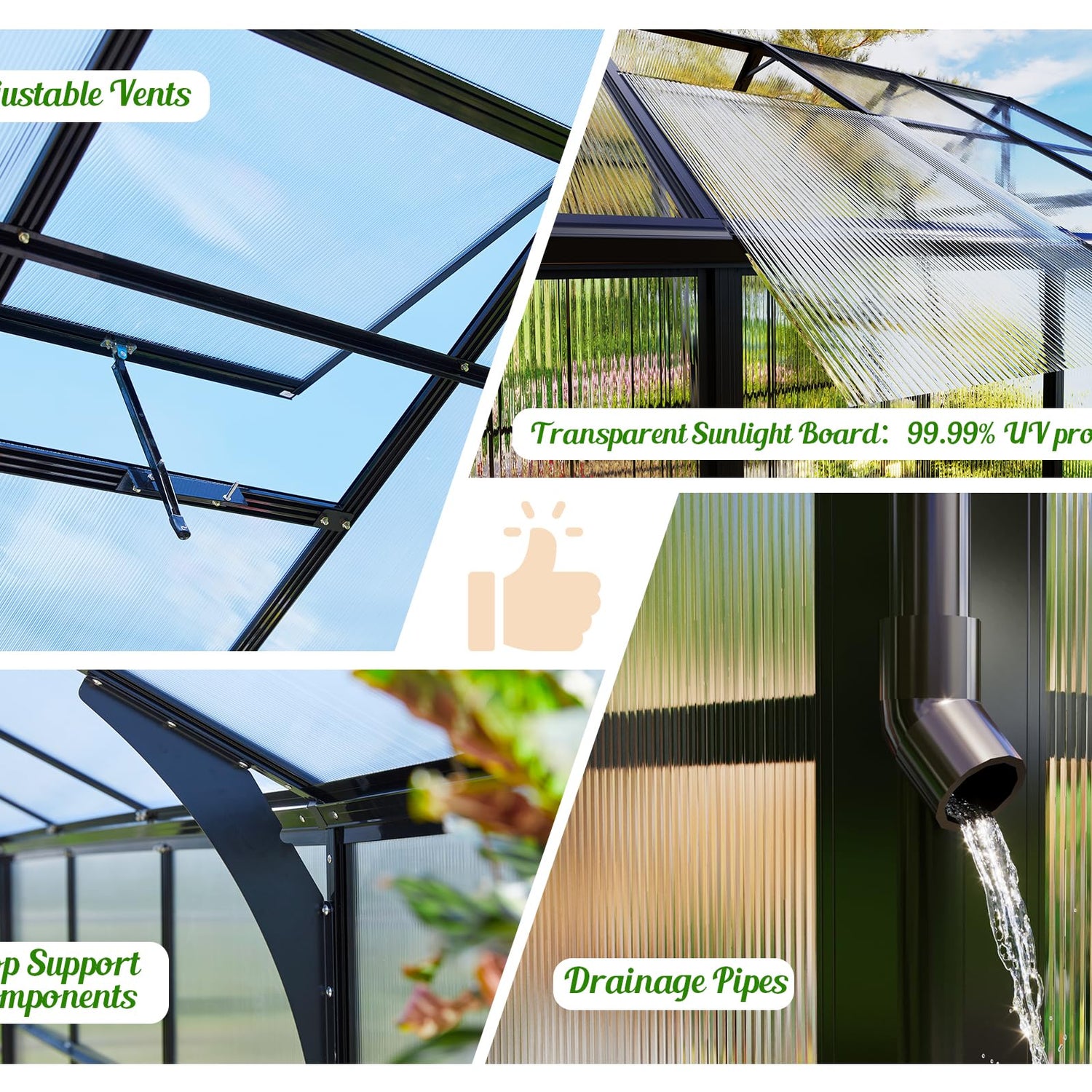 - Ventilable and Drainable: 5 roof window vents with manual openers and drainpipes ensuring air and water circulation of the heavy duty greenhouse.
