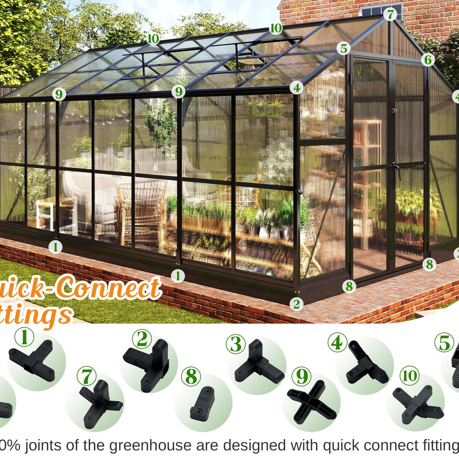 - Quick-Connect Fittings: 60% joints of the greenhouse are designed with patented quick connect fittings that can be installed by just three people in 10 hours and have a service life of 10 years.