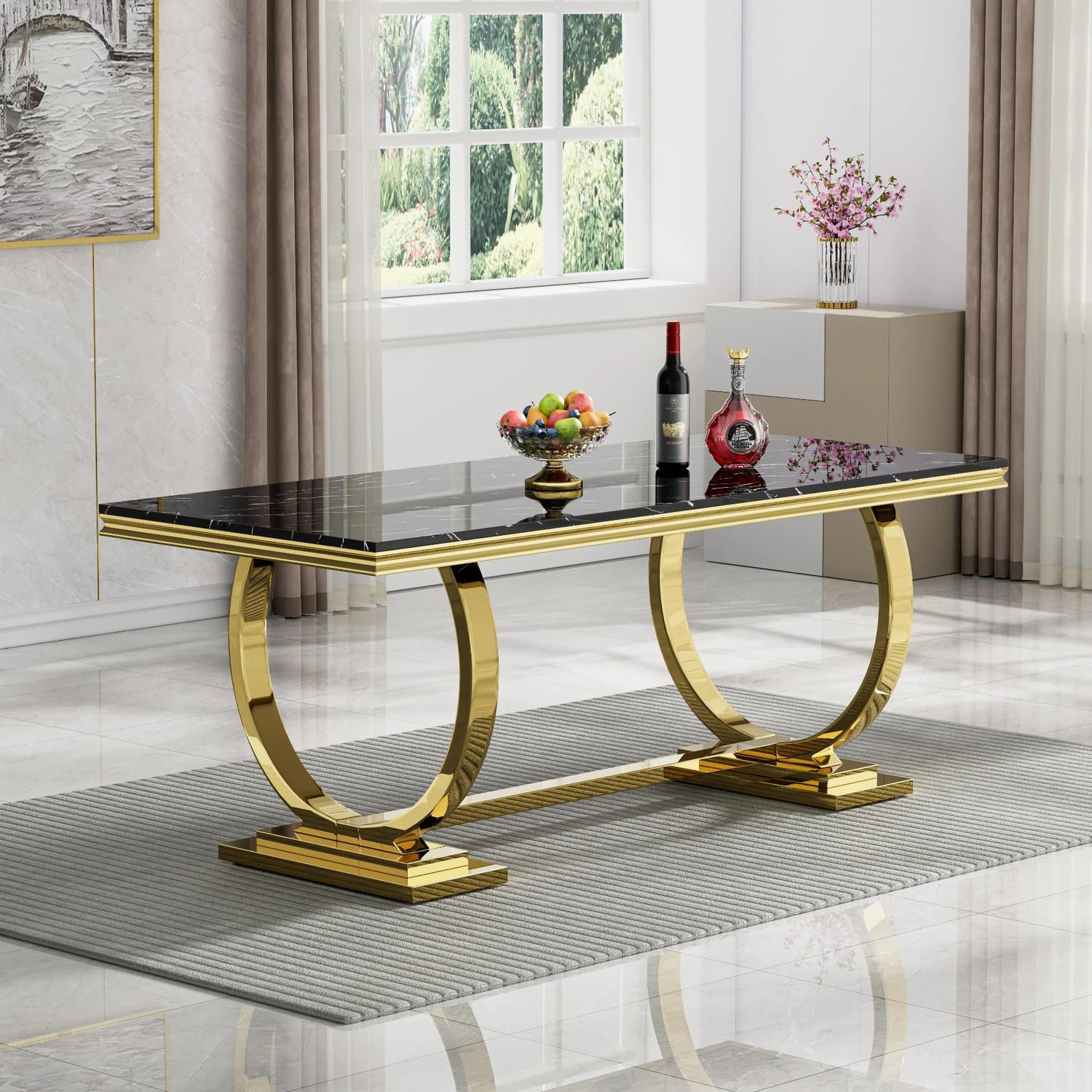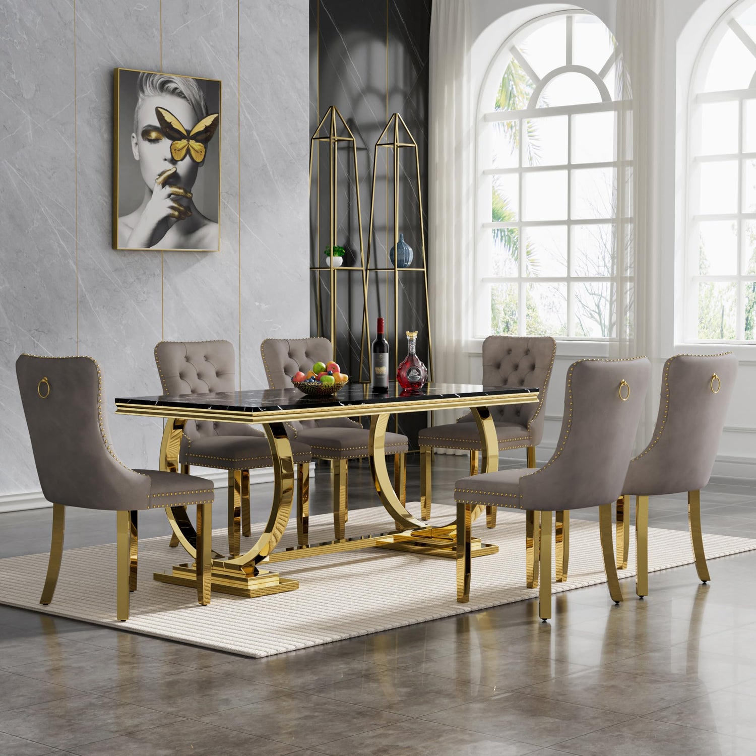 - ➤【Modern 7 Pieces Dining Table Set】- Luxury 7 pieces dining table set consisting of 1 black imitation marble 70inch rectangular dining table and 6 velvet upholstered dining chairs which makes it perfectly sized for a dinette, kitchen, or any dining area. This marble texture top dining table with gold mirrored finish stainless steel o-shape frame will add elegance to your dining room and can easily blend in with any home decors.