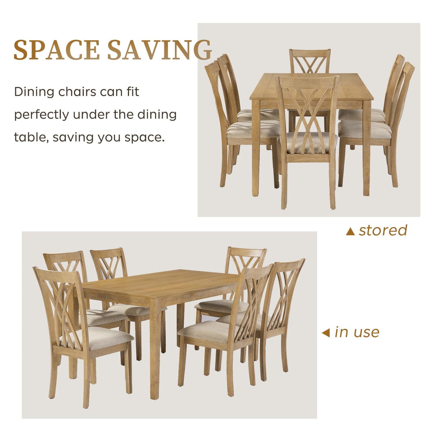 7-Piece Farmhouse Dining Table Set with 6 Upholstered Chairs & 60-Inch Solid Wood Table, Whitewash Finish - Rustic Kitchen Furniture, Padded Seats, Comfortable Dining Room Set for 6