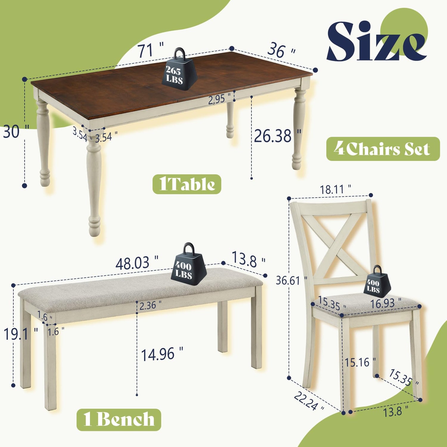 • 6-Piece Dining Table Set: 71" large dining table and comes with 4 upholstered chairs and a stylish bench, comfortably seating 6-7. Perfect for family meals or gatherings in your dining room or kitchen