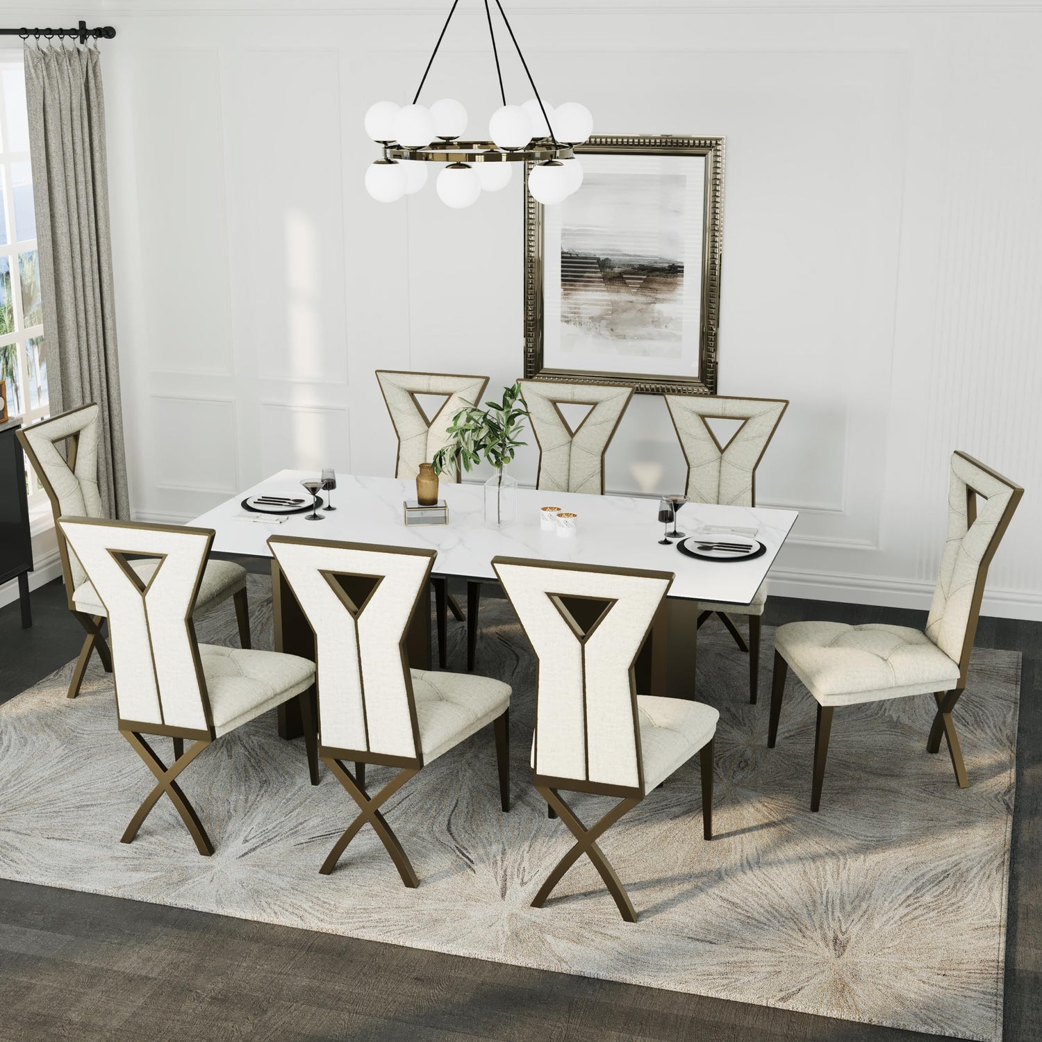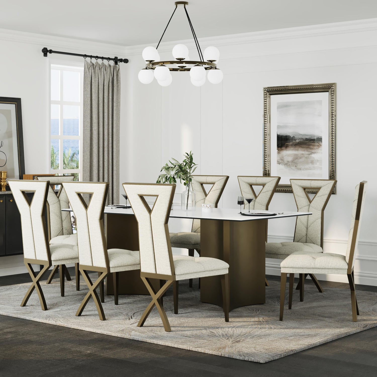 Anewsun 9 Piece Dining Table Set, Brushed Bronze Dining Room Table Set with 78 inch White Stone Table and 8 White Chenille Dining Chairs