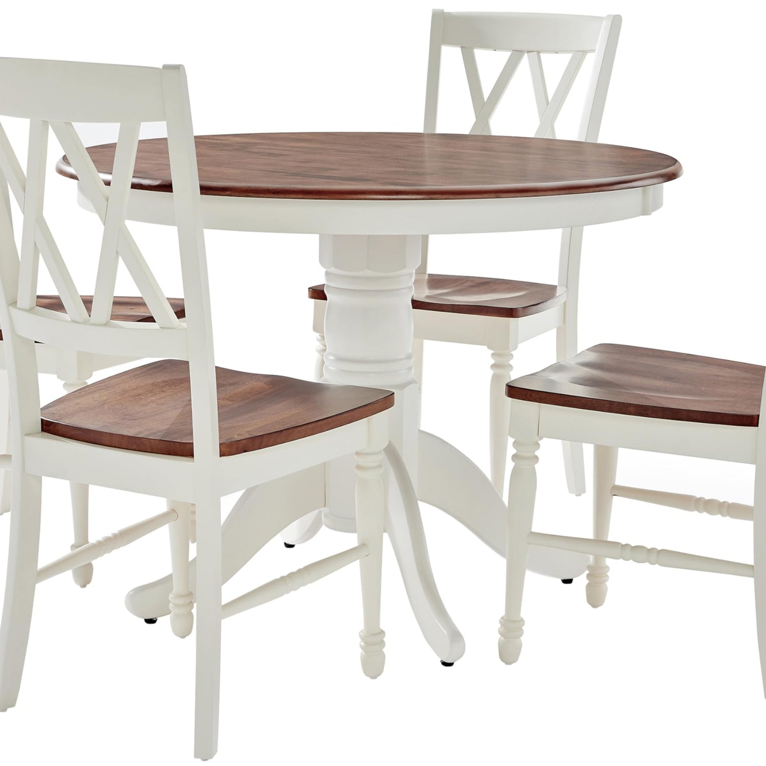 Details: Ideal for an eat-in kitchen or dining room, the Shelby 5 Piece Round Dining Set was designed with tradition in mind. Featuring sturdy wood construction with classic turned legs, the Shelby Dining Set can pair with design aesthetics ranging from farmhouse to traditional. The open x-back chairs and pedestal base provide comfortable seating for four.