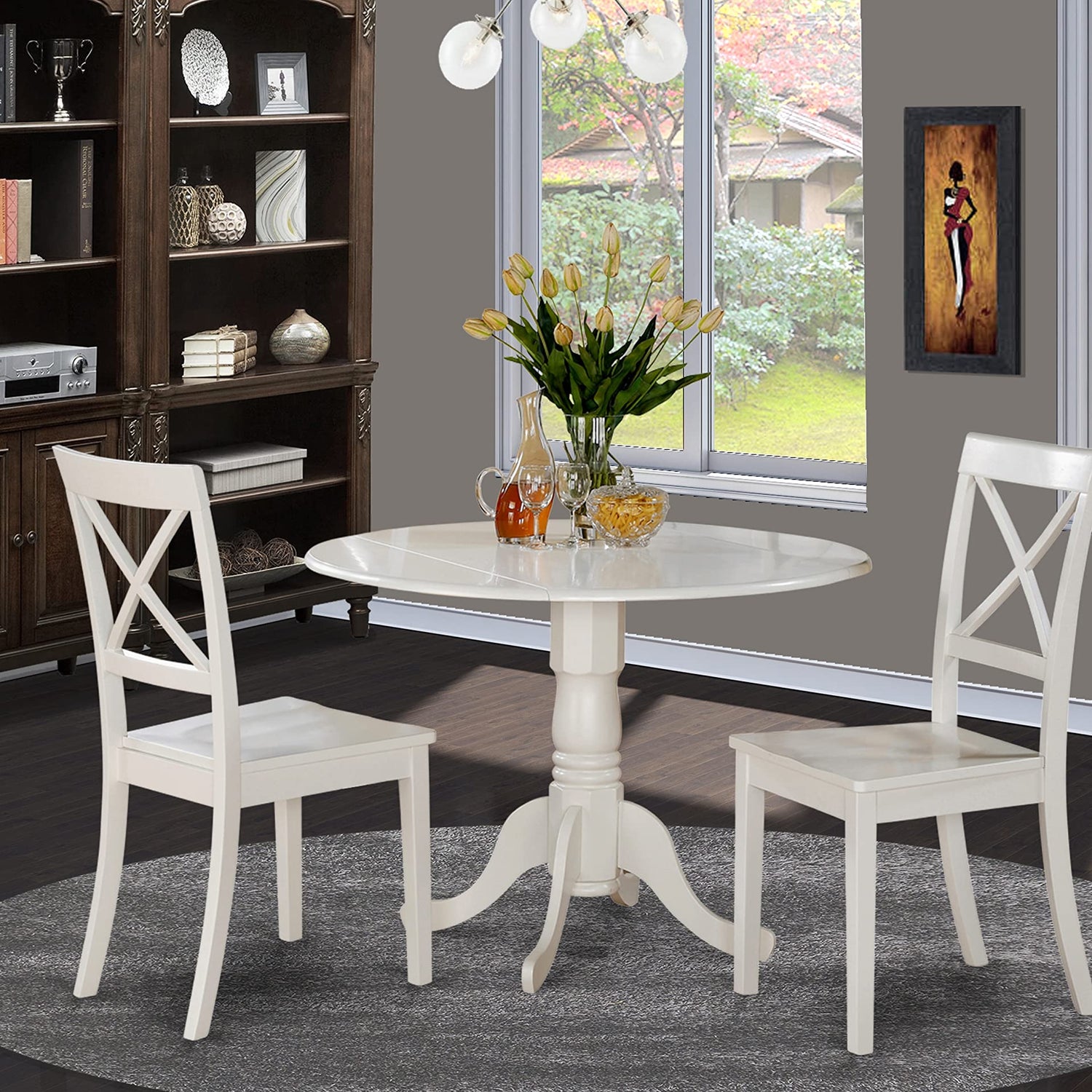 East West Furniture DLBO3-WHI-W 3 Piece Dining Room Table Set Contains a Round Kitchen Table with Dropleaf and 2 Dining Chairs, 42x42 Inch, Linen White
