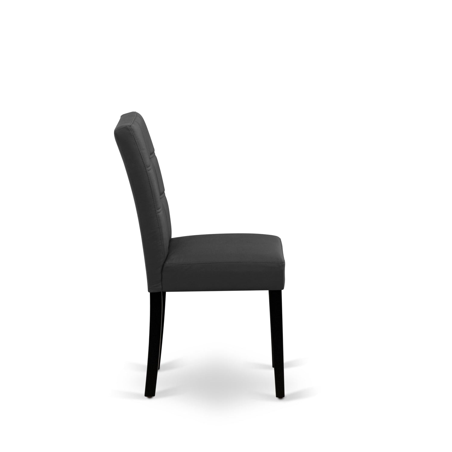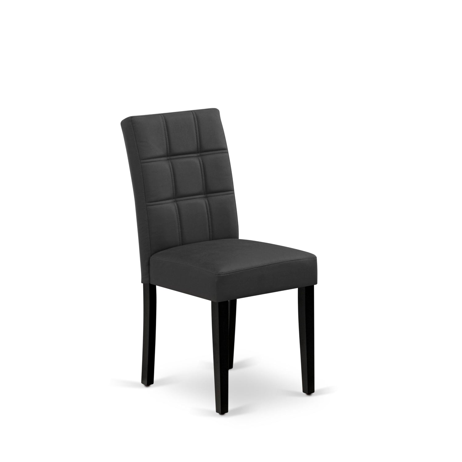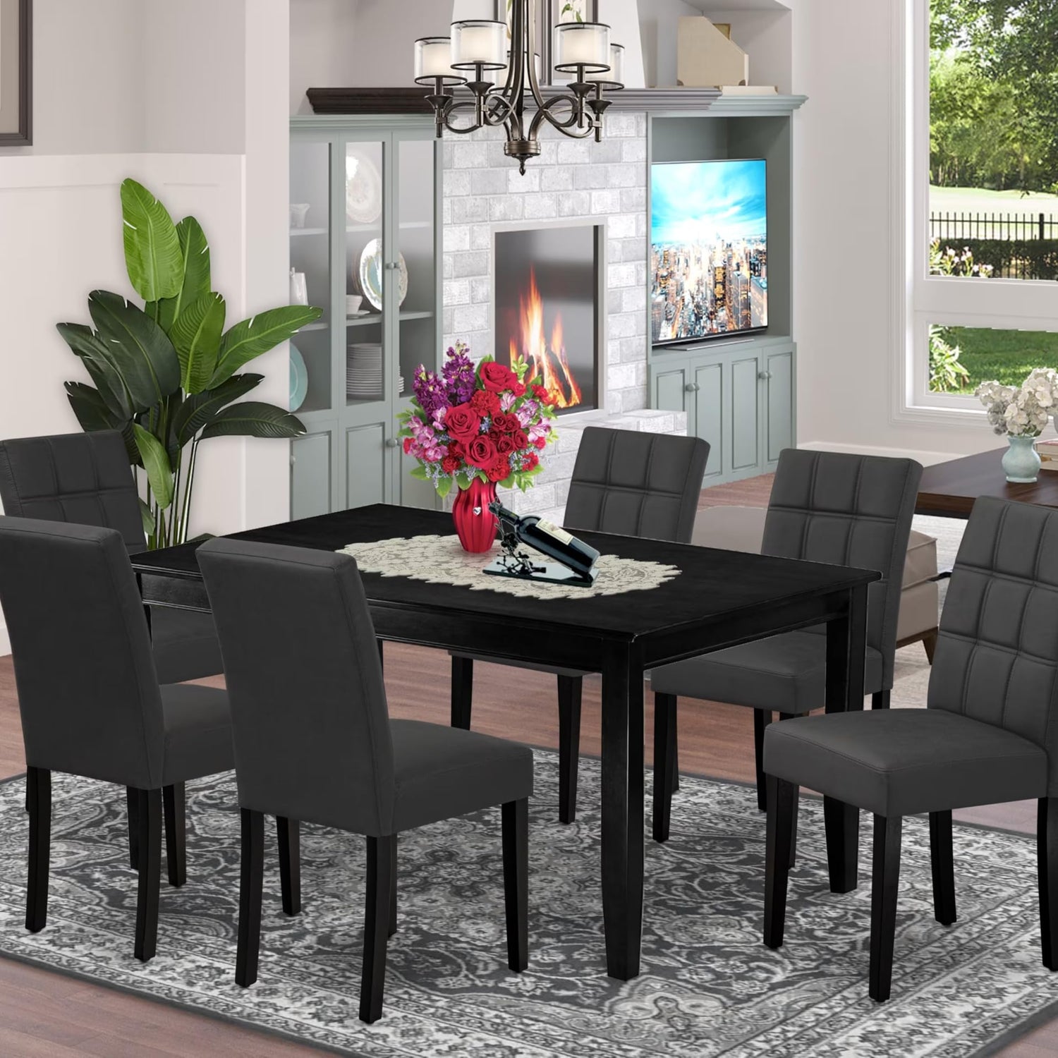 The 7-piece contemporary kitchen table set effortlessly combines style, functionality, and comfort to enhance The atmosphere of your dining area. This dining collection consists of a rectangular table and 6 parson kitchen chairs, all carefully designed to elevate your dining experience. Achieving a seamless blend of traditional and modern aesthetics, the dining table features a sleek black tabletop and matching black wooden legs. The parson dining chairs are adorned with Dark Gray Faux Leather upholstery that complements The black wooden legs. Crafted from high-quality rubberwood, this kitchen table set guarantees long-lasting durability for everyday use. Rubberwood's natural strength and resistance to wear and tear make it an ideal choice for daily dining. The dining chairs, equipped with easy-to-clean faux Leather seats and stylish chair backs, are highly practical for families. Assembly and maintenance are straightforward, as you can easily put together The chairs and table at home, and standard furniture cleaners will keep Them looking immaculate. This compact kitchen table set consistently offers a fresh and welcoming appearance, making it an exceptional addition to your dining room.