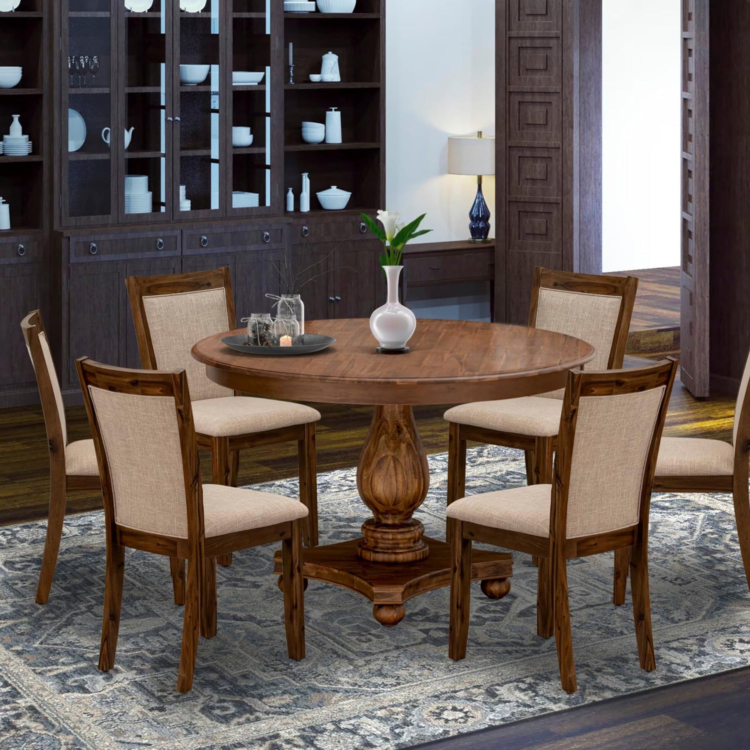 East West Furniture F2MZ7-N04 7 Piece Dining Room Furniture Set Consist of a Round Dining Table with Pedestal and 6 Light Tan Linen Fabric Upholstered Chairs, 48x48 Inch, Antique Walnut