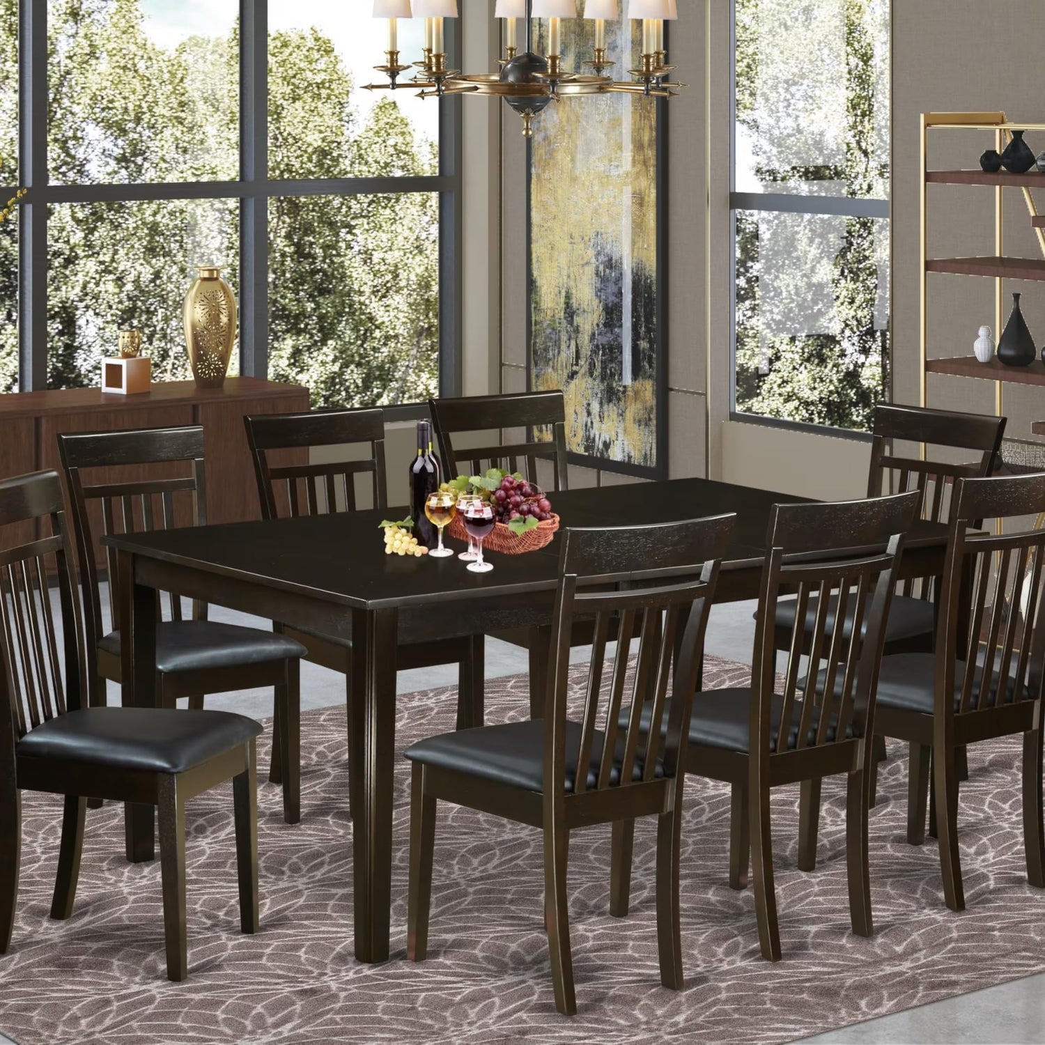 Add elegance to your dining room with this dining table set. It includes 8 wood chairs with Faux Leather seats and a self-storing butterfly leaf rectangular modern dining table. The self-storing butterfly leaf table has a rectangular shape with 4 lovely wooden legs, all coated in a high-quality Cappuccino color. Crafted from premium quality Asian Hardwood, this set offers durability and a standard appearance. Well-designed for modern houses, our dining table set is a beautiful addition to your home. Use the self-storing butterfly leaf rectangular dining table and wood chairs in the dining room or kitchen. The dining chairs have a high-slatted back with comfortable Faux Leather seats and gorgeous legs. Designed for easy maintenance and everyday use, they provide a comfortable dining experience. Create more space in your dining room by moving the chairs to the table after dinner. The Faux Leather dining chairs add grace to your dining area, perfect for gatherings and celebrations. Assemble the self-storing butterfly leaf dining table and chairs easily. For any confusion, feel free to contact us. Buy our products with confidence, as customer satisfaction is our priority.